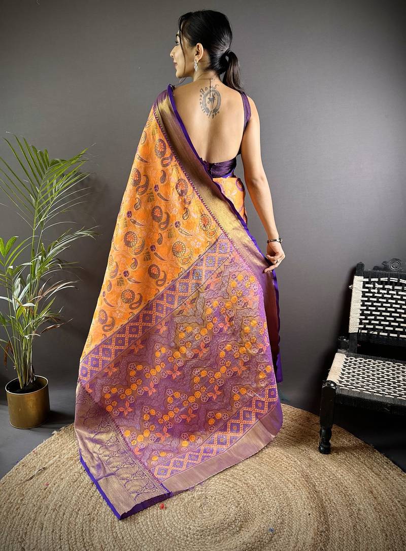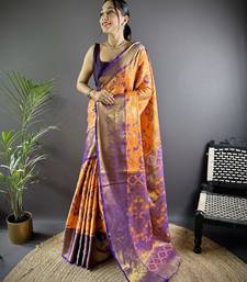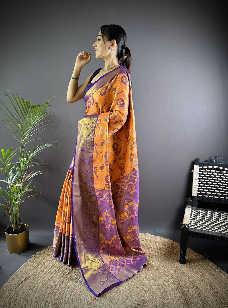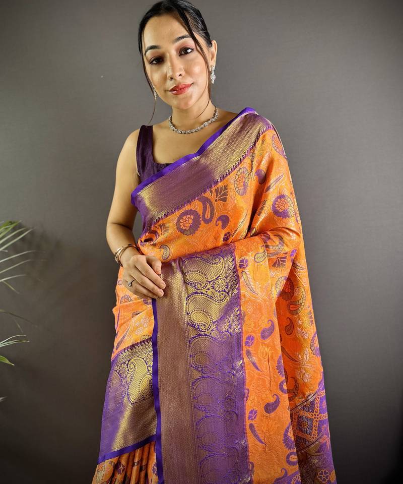 Orange floral, paisely, zari woven kanjivaram tissue silk saree with blouse