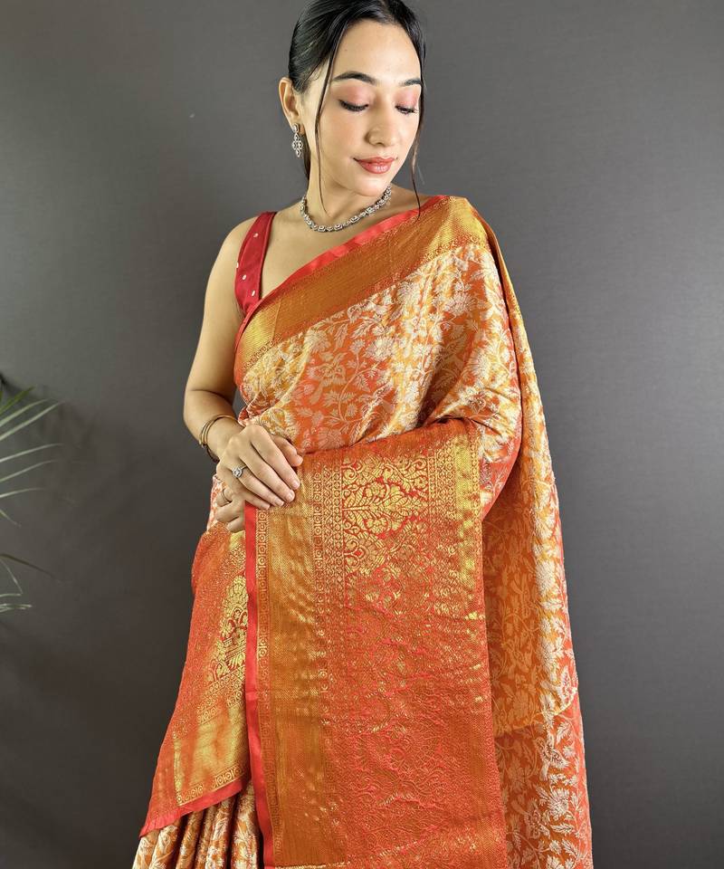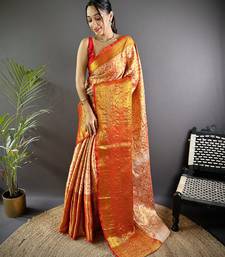 Orange floral, peacock zari woven kanjivaram tissue silk saree with blouse