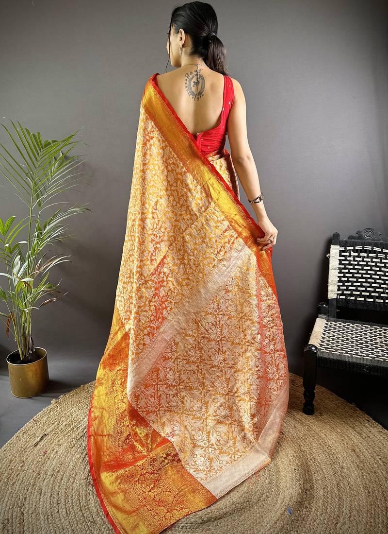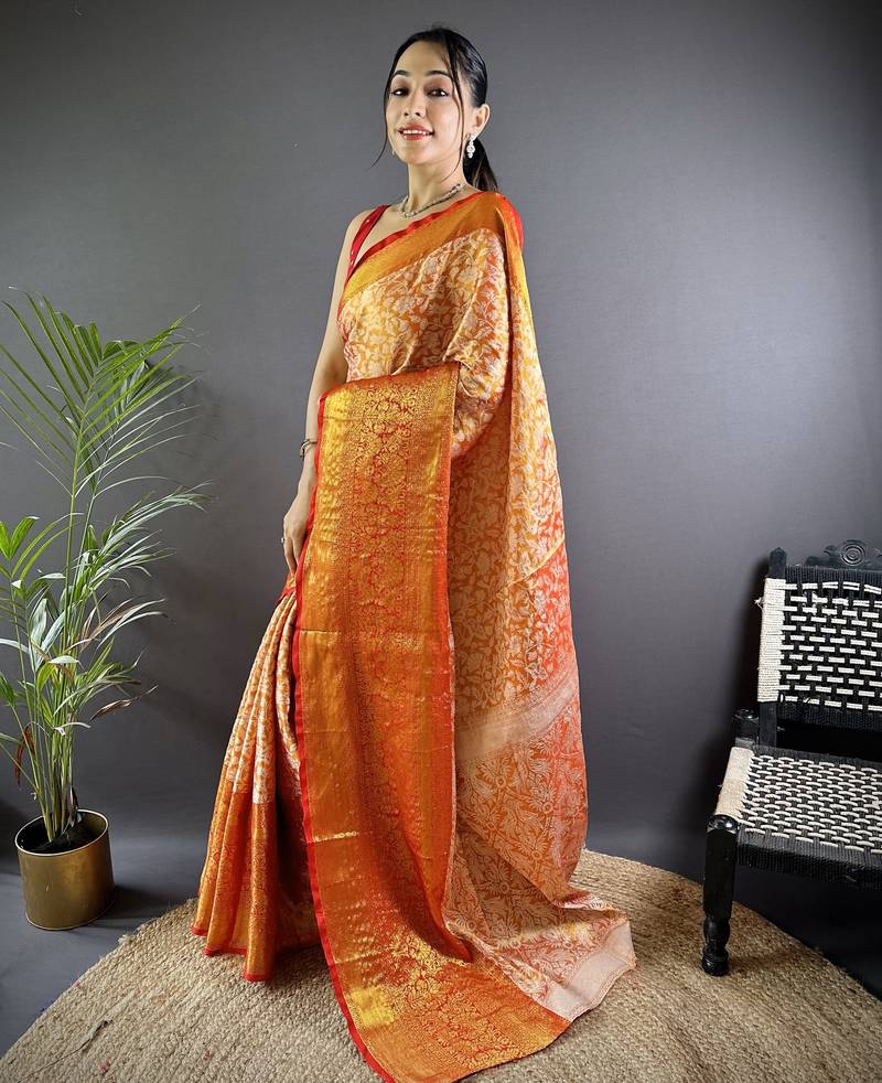 Product Name Orange Floral, Peacock Zari Woven Kanjivaram Tissue Silk Saree With Blouse