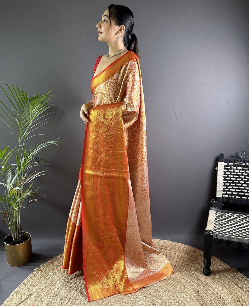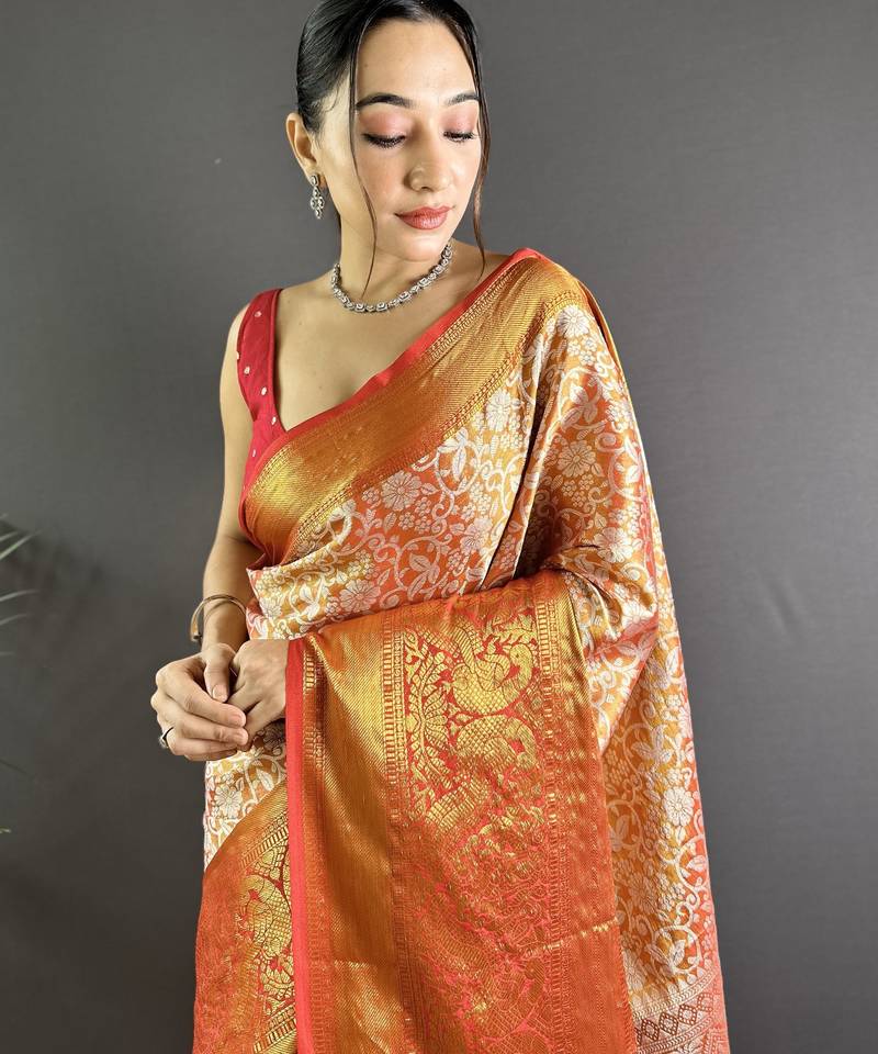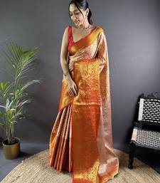 Orange floral, peacock zari woven kanjivaram tissue silk saree with blouse
