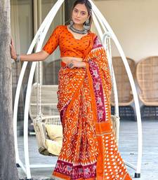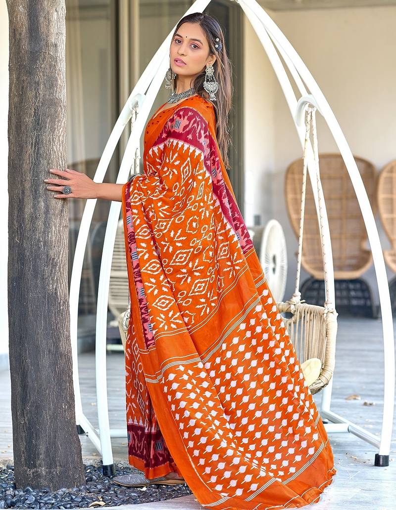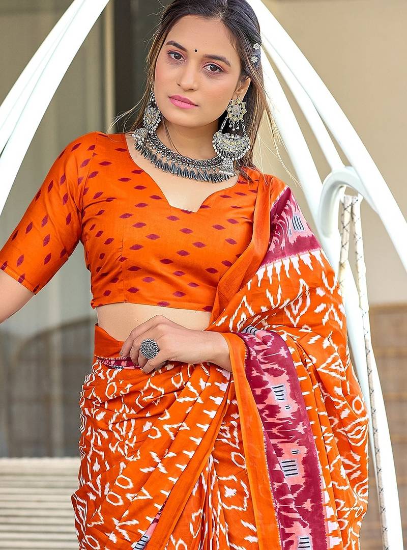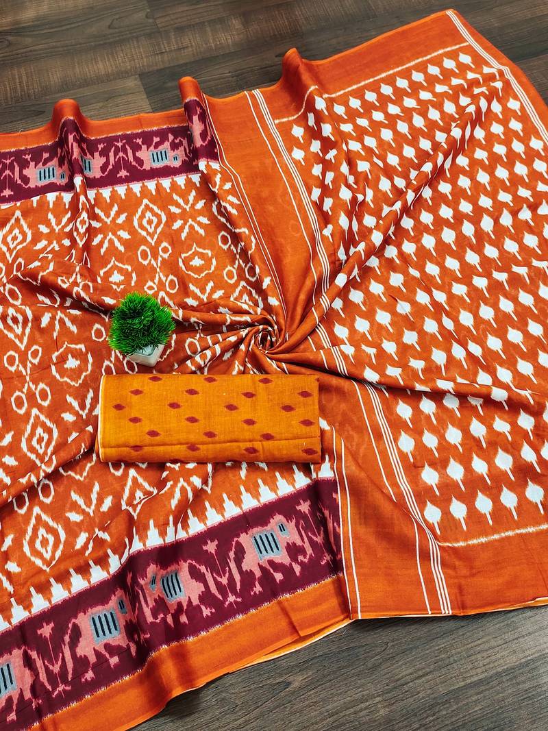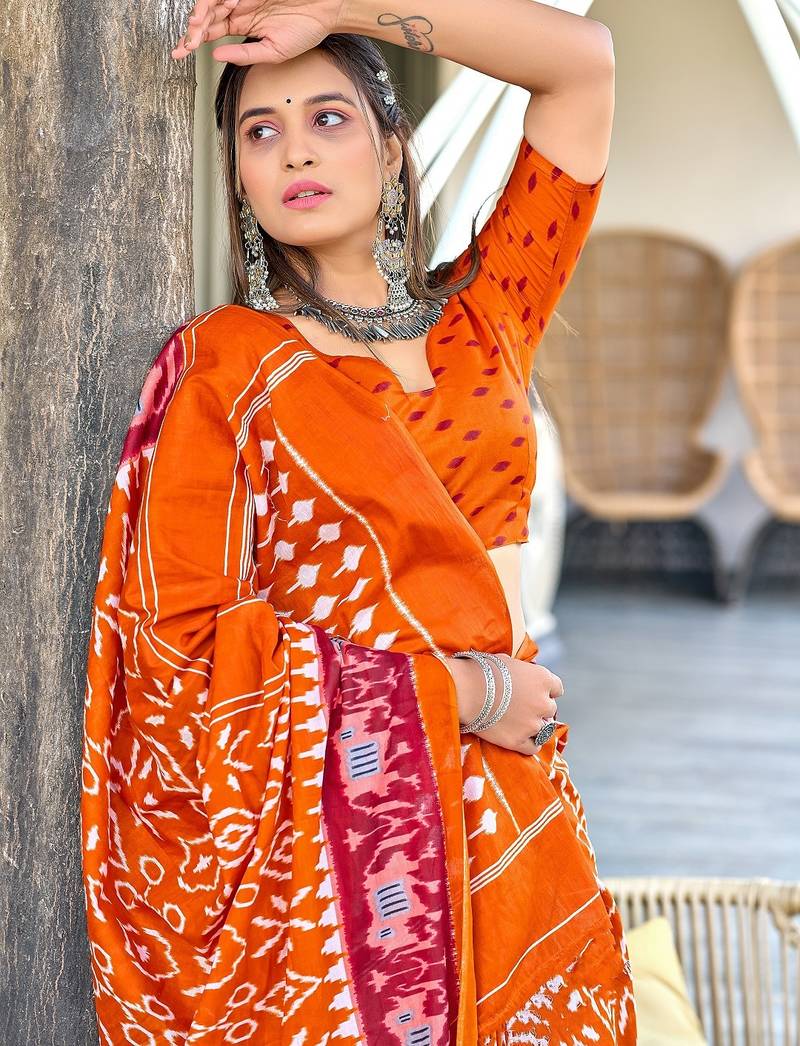 | Product Name | Orange Ikkat Print Mulmul Cotton Saree With Blouse. | |