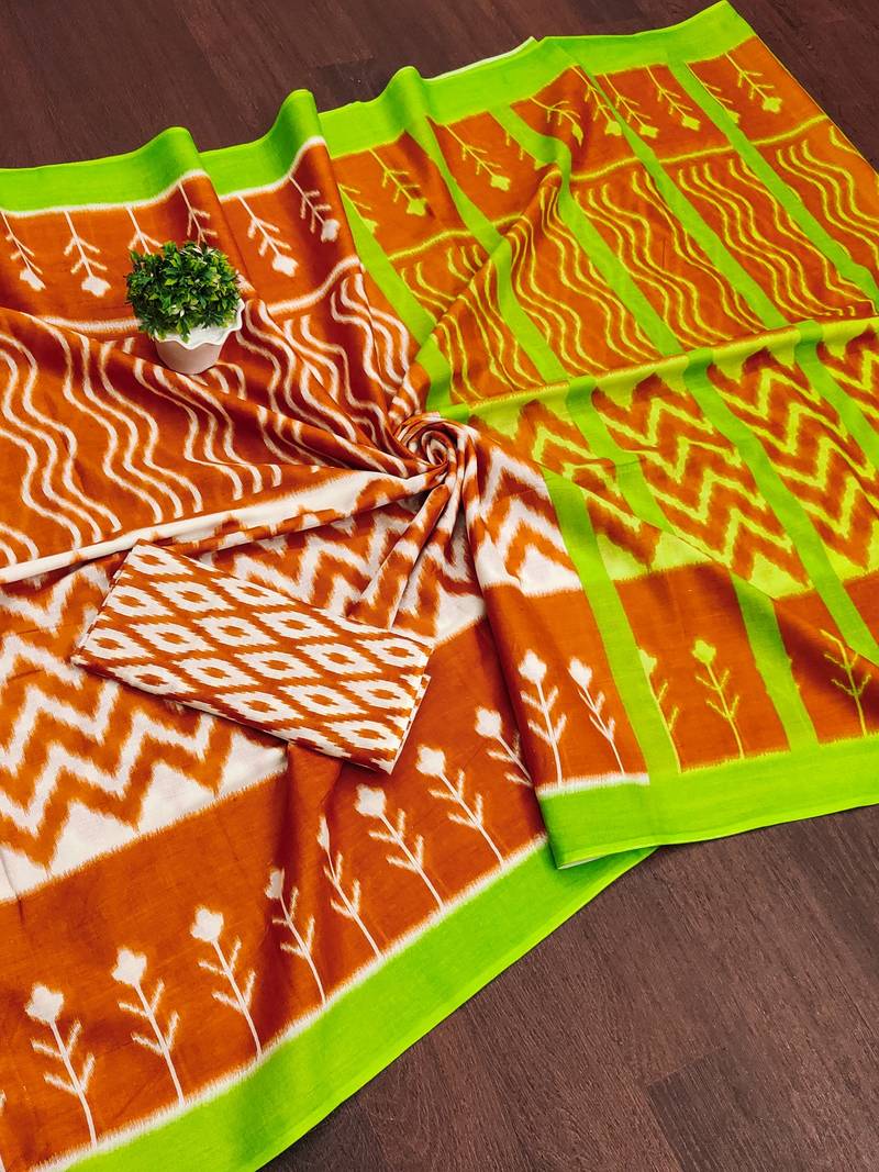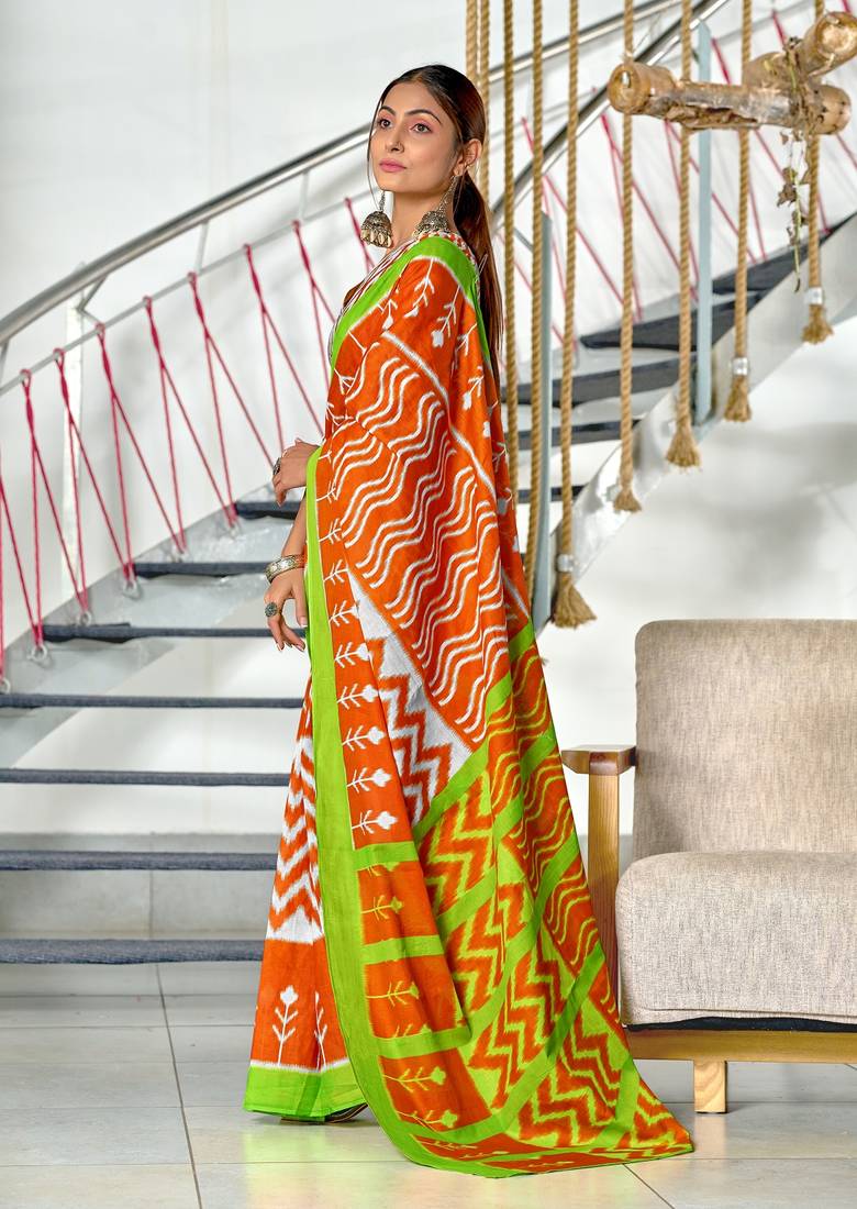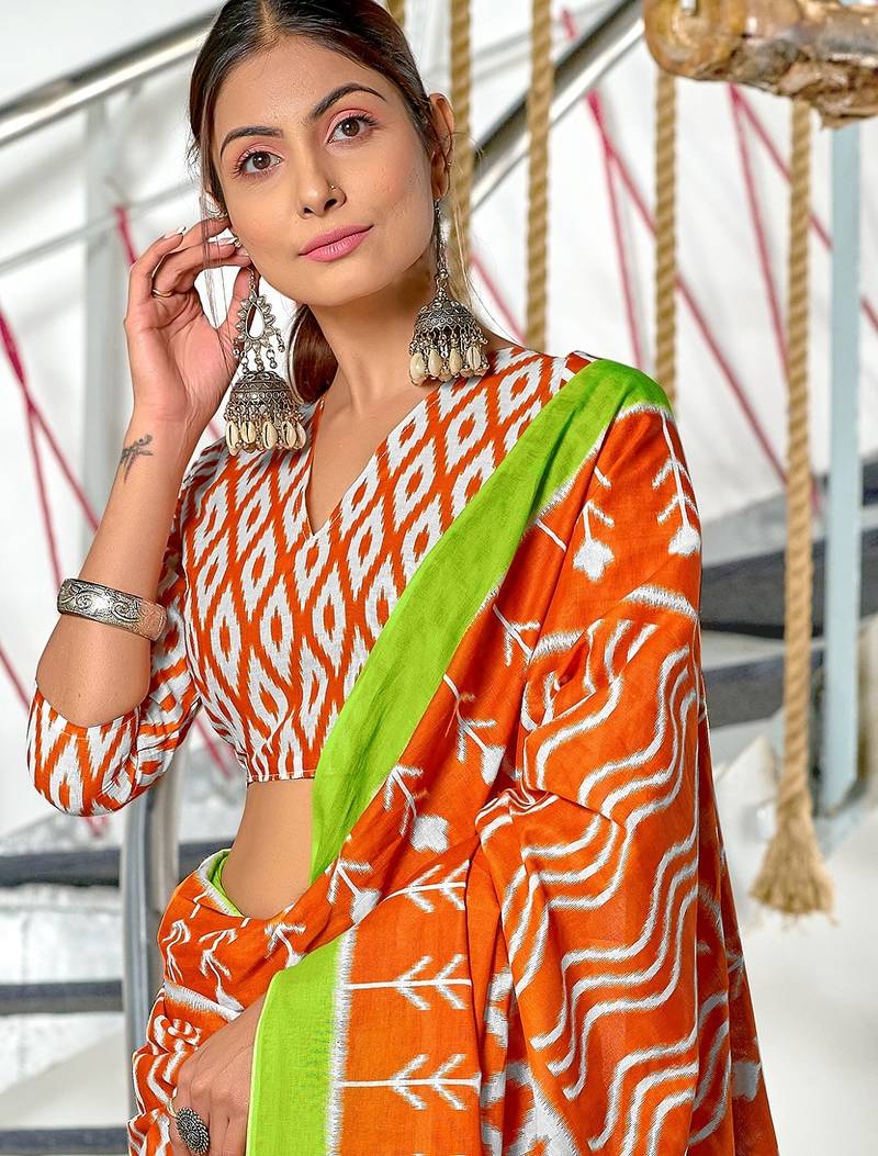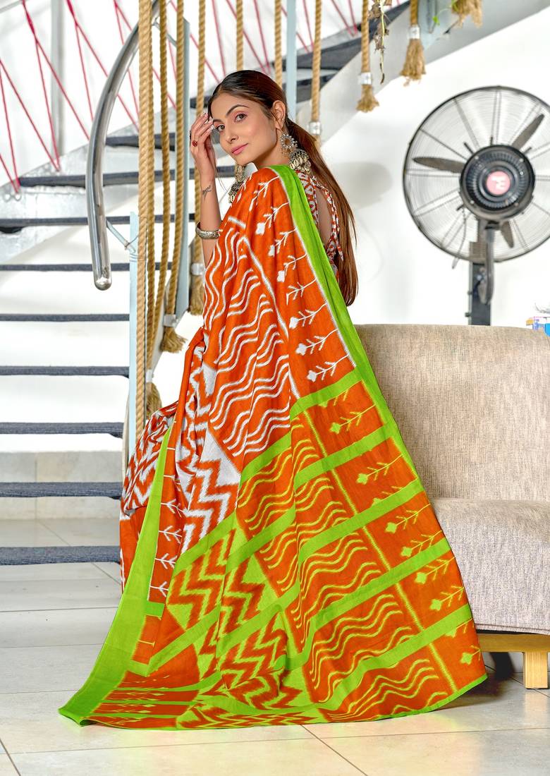 | Product Name | Orange Ikkat Print Mulmul Cotton Saree With Blouse. | |