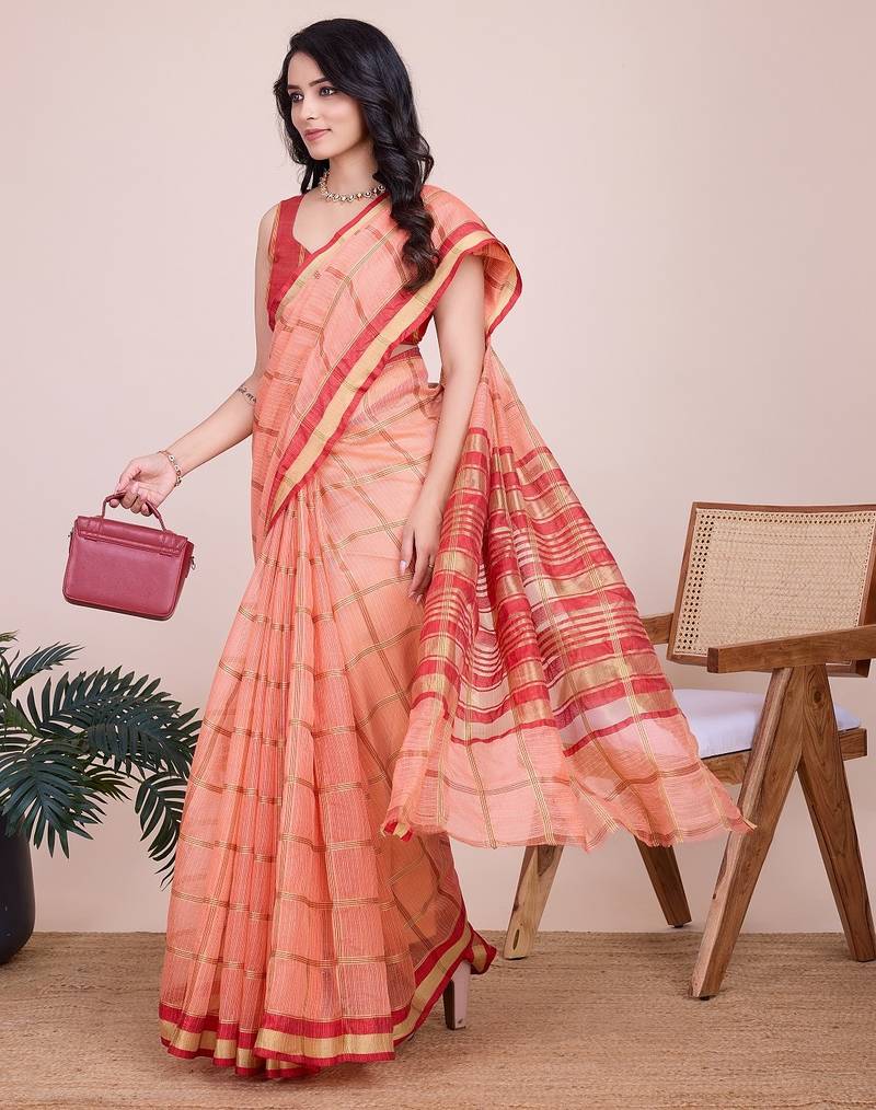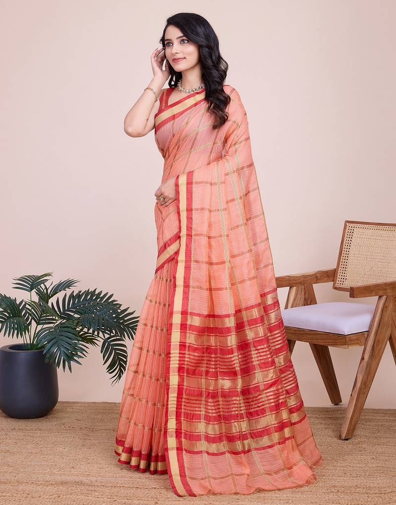 | Product Name | Peach Woven Checkered Striped Cotton Silk Kota Doria Saree With Blouse | |