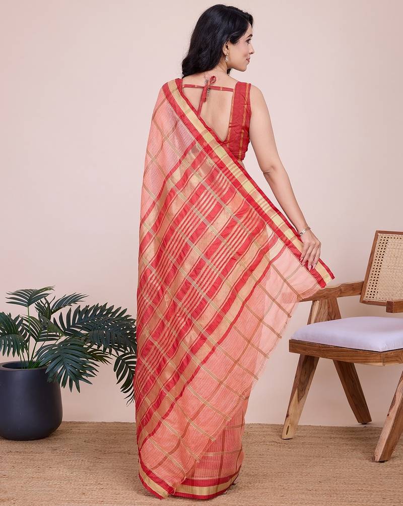 Peach woven checkered striped cotton silk kota doria saree with blouse