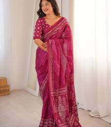 Pink blocked printed, floral print soft pure cotton saree with blouse.