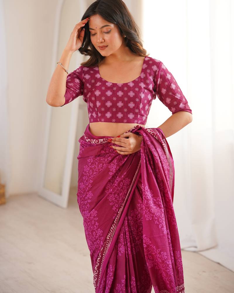 | Product Name | Pink Blocked Printed, Floral Print Soft Pure Cotton Saree With Blouse. | |