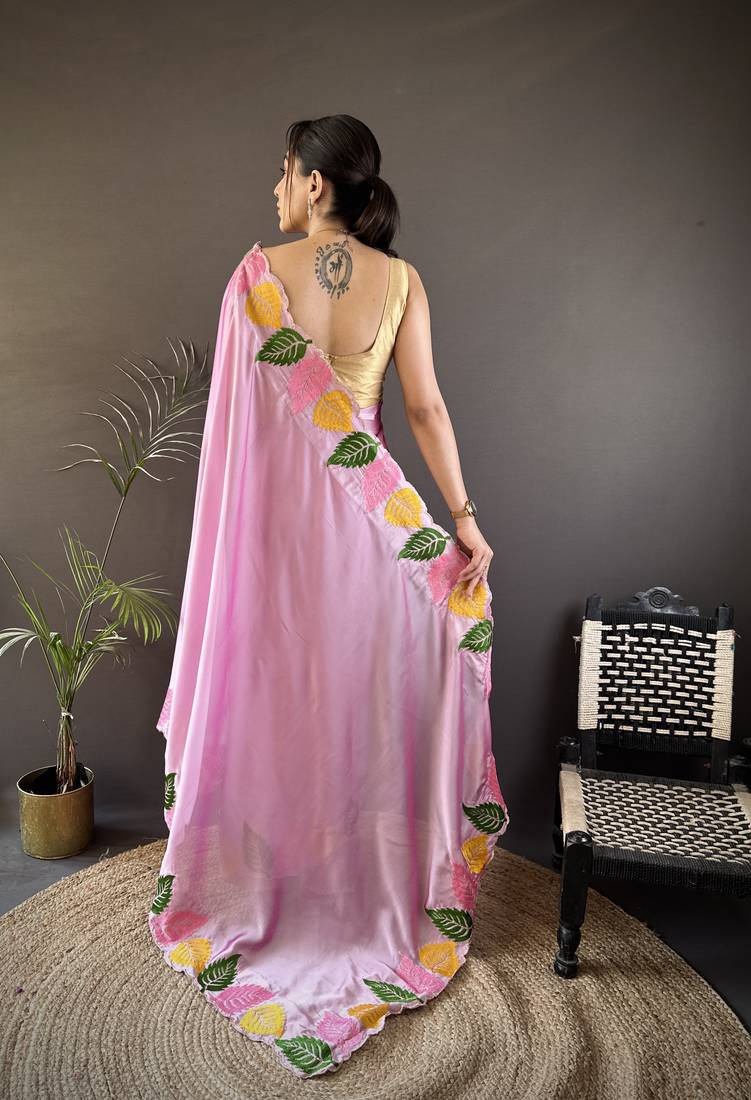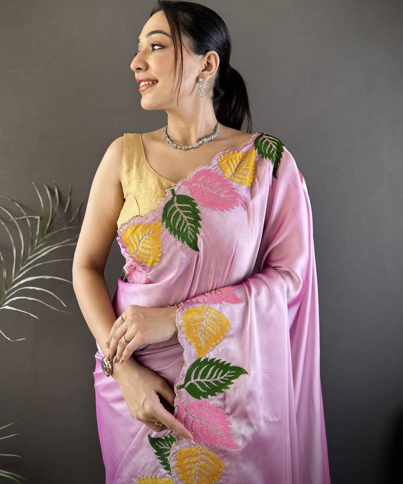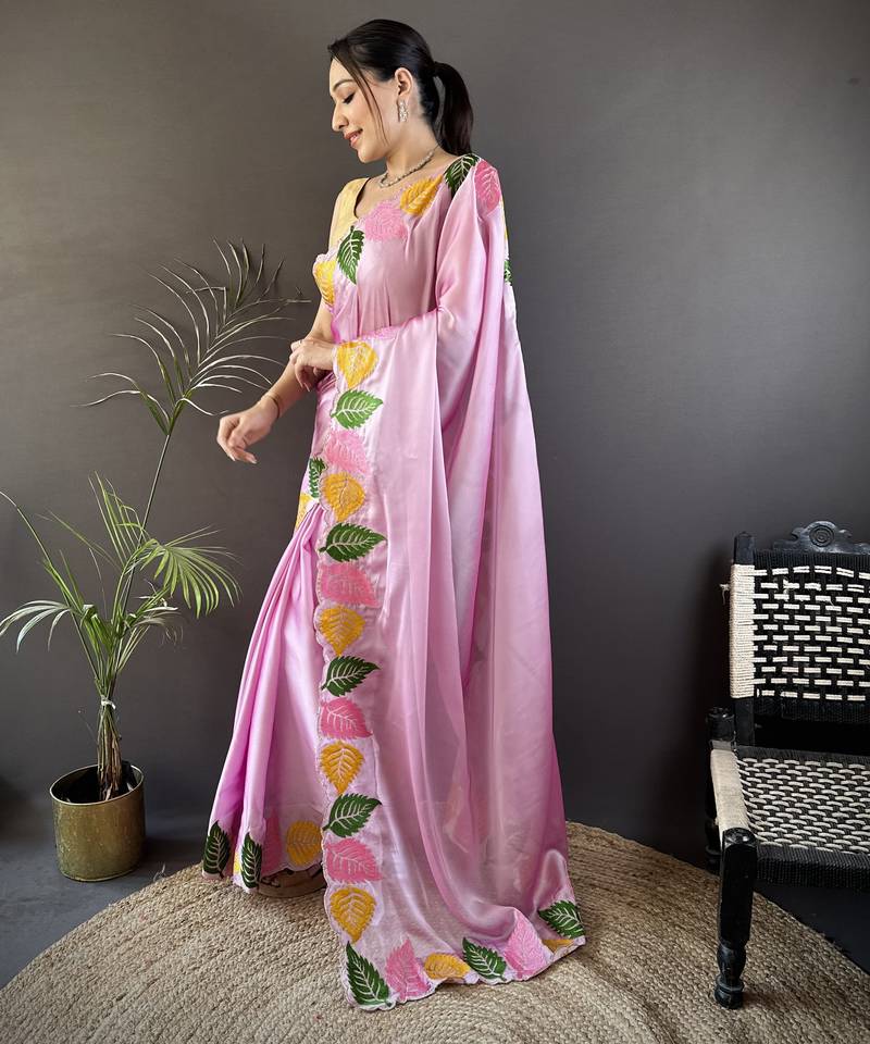 | Product Description | Add A Touch Of Effortless Elegance To Your Wardrobe With This Charming Saree, Designed To Exude Grace And Femininity. Crafted From A Smooth, Lightweight Fabric, This Saree Features Delicate Embroidered Leaf Motifs In Vibrant Shades Of Green, Yellow, And Pink, Beautifully Running Along The Border For A Fresh And Contemporary Appeal. The Soft Pastel Hue Combined With Intricate Detailing Makes It A Perfect Choice For Daytime Festivities, Brunch Gatherings, And Casual Celebrations. Its Fluid Drape Ensures Comfort While Enhancing Your Natural Silhouette With A Subtle, Sophisticated Charm. Paired With A Matching Blouse, This Saree Strikes The Perfect Balance Between Modern Simplicity And Artistic Craftsmanship. |