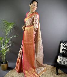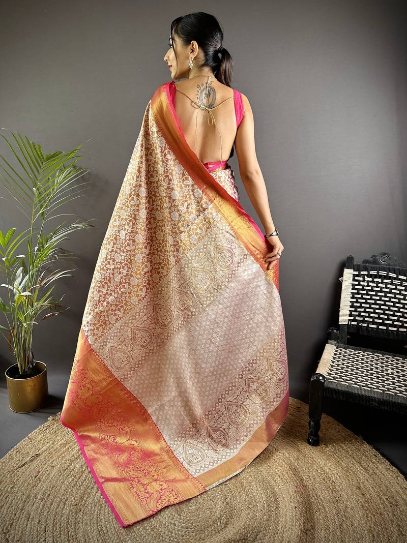 Pink floral, peacock zari woven kanjivaram tissue silk saree with blouse