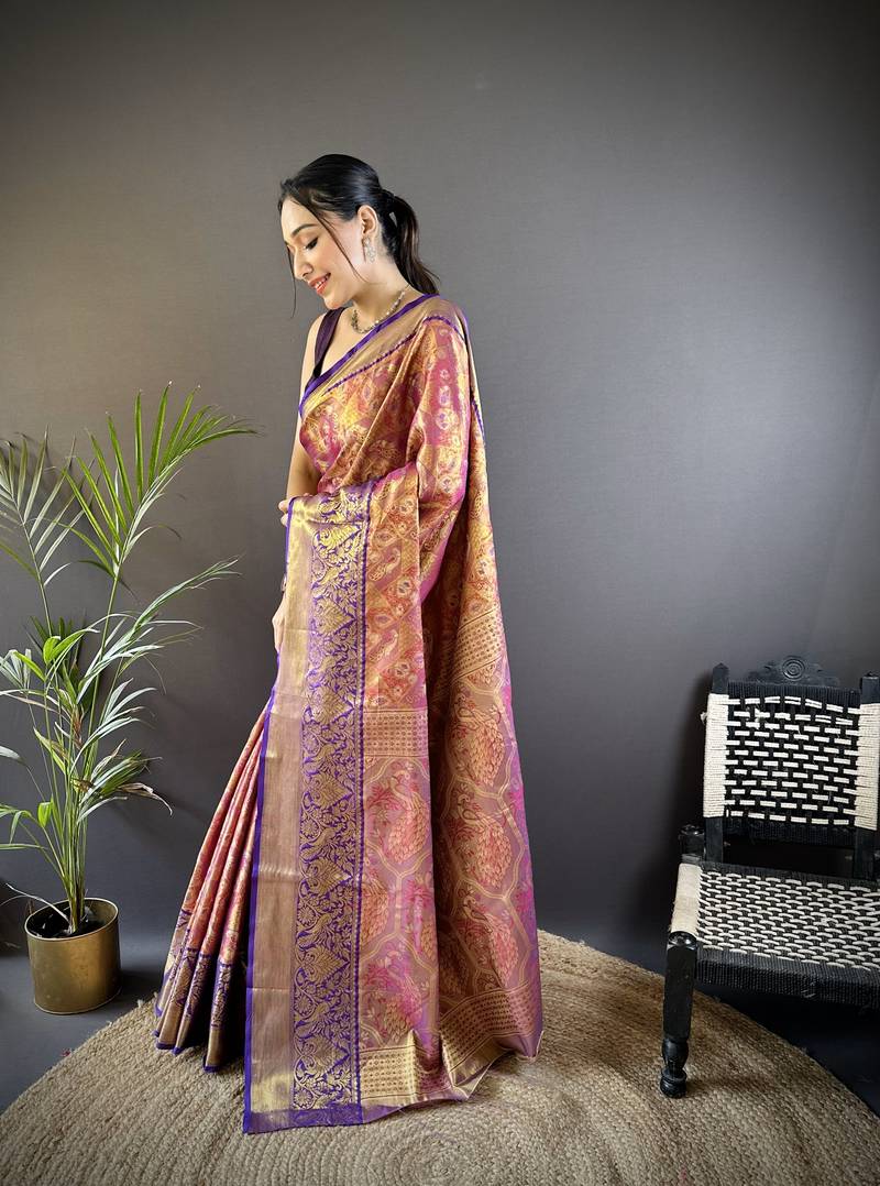 Pink floral, peacock zari woven tissue silk saree with blouse