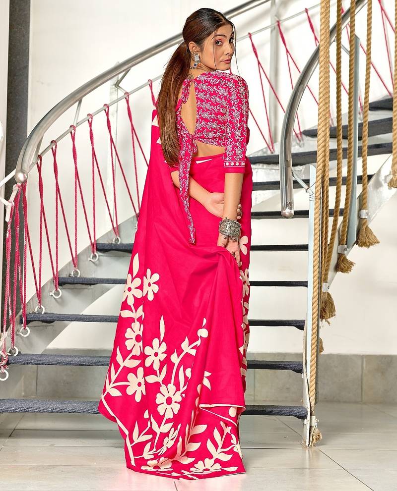Pink floral print mulmul cotton saree with blouse.