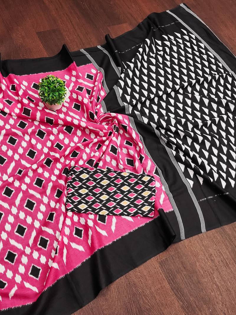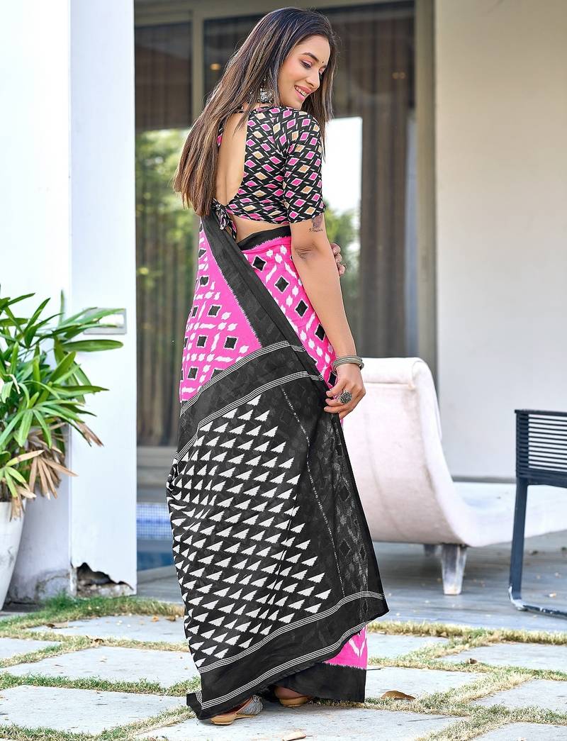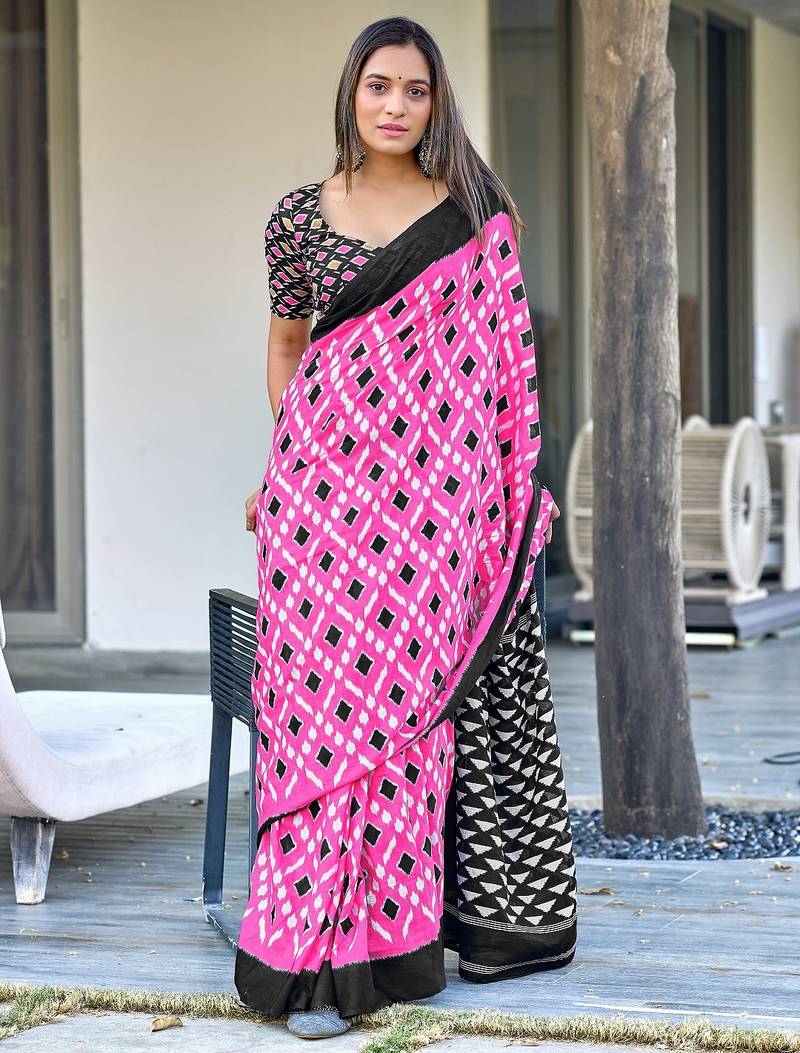 | Product Name | Pink Ikkat Print Mulmul Cotton Saree With Blouse. | |