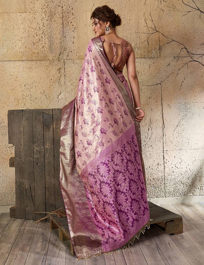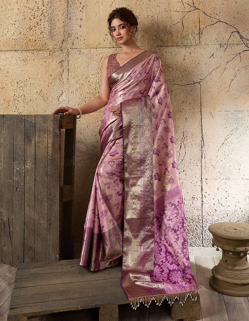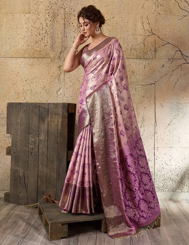 Pink kanjivaram, zari woven semi silk banarasi saree with blouse