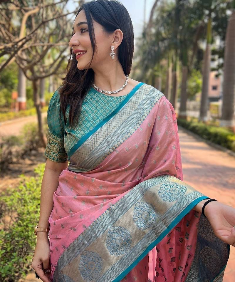 | Product Name | Pink Woven Self Design Embellished Tissue Kanjivaram Saree With Blouse | |
