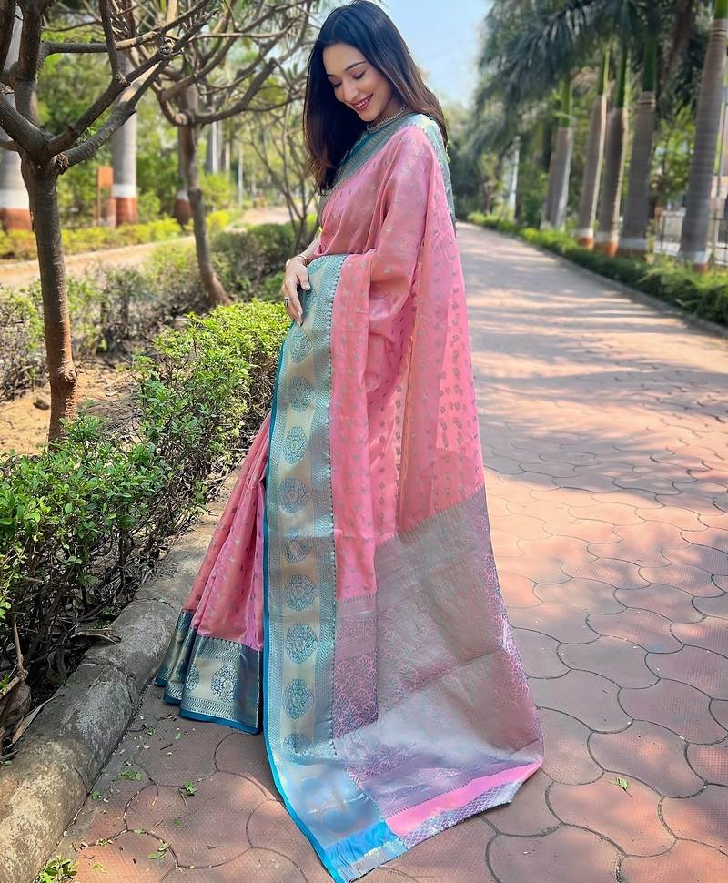 Pink woven self design embellished tissue kanjivaram saree with blouse
