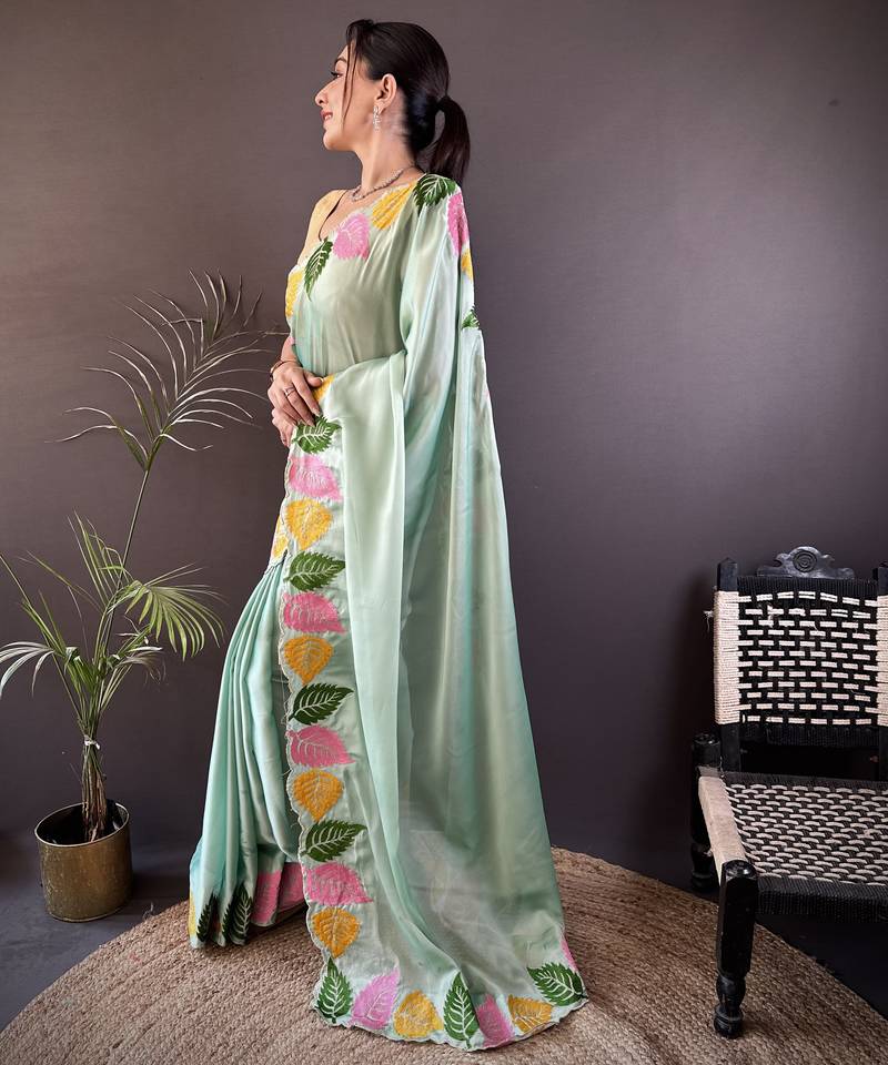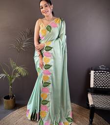 Pista green floral emboidery, solid rangoli silk saree with blouse