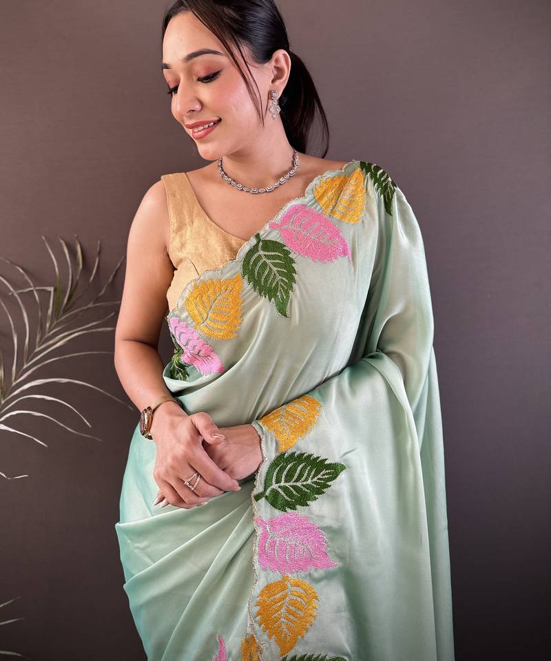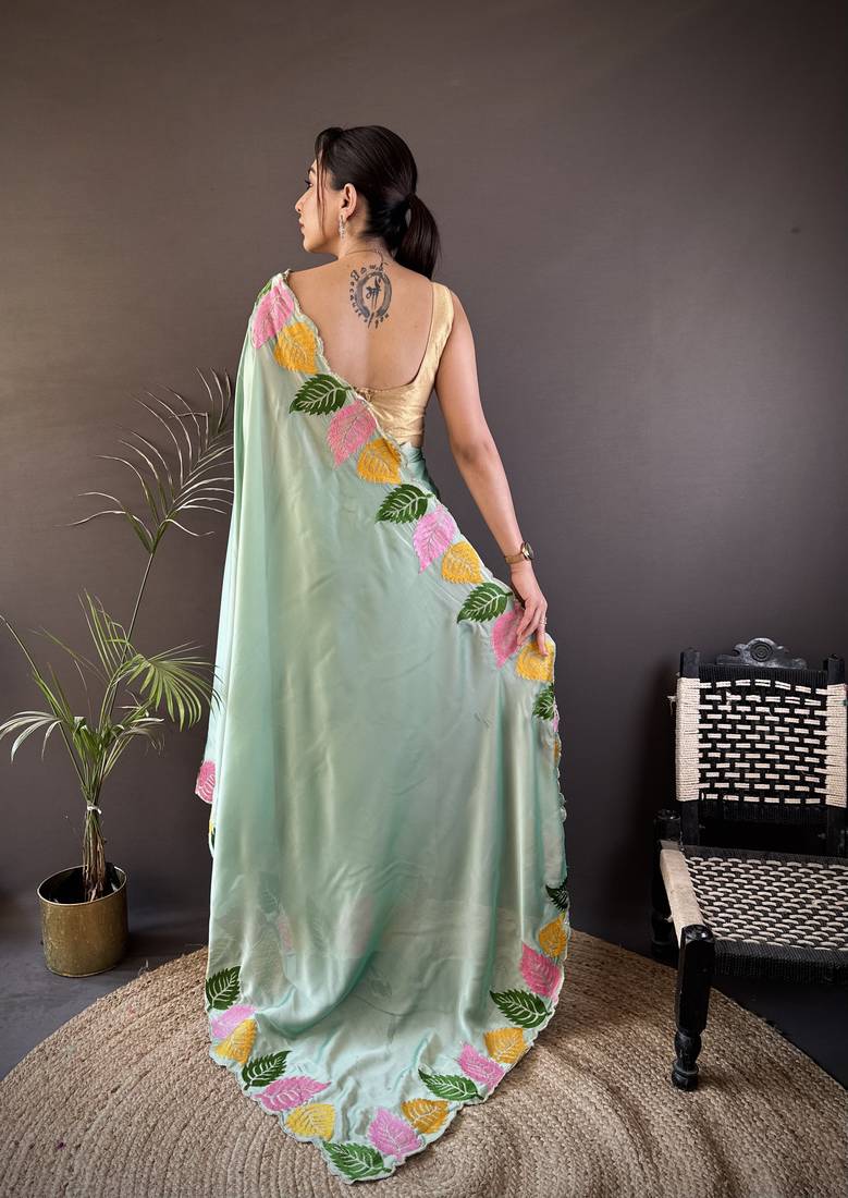 | Product Description | Add A Touch Of Effortless Elegance To Your Wardrobe With This Charming Saree, Designed To Exude Grace And Femininity. Crafted From A Smooth, Lightweight Fabric, This Saree Features Delicate Embroidered Leaf Motifs In Vibrant Shades Of Green, Yellow, And Pink, Beautifully Running Along The Border For A Fresh And Contemporary Appeal. The Soft Pastel Hue Combined With Intricate Detailing Makes It A Perfect Choice For Daytime Festivities, Brunch Gatherings, And Casual Celebrations. Its Fluid Drape Ensures Comfort While Enhancing Your Natural Silhouette With A Subtle, Sophisticated Charm. Paired With A Matching Blouse, This Saree Strikes The Perfect Balance Between Modern Simplicity And Artistic Craftsmanship. |