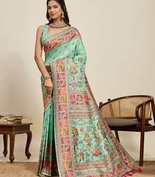Pista green floral print woven soft silk kalamkari saree with blouse