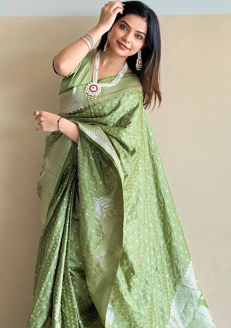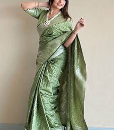 Pista green woven self design antique silk banarasi saree with blouse