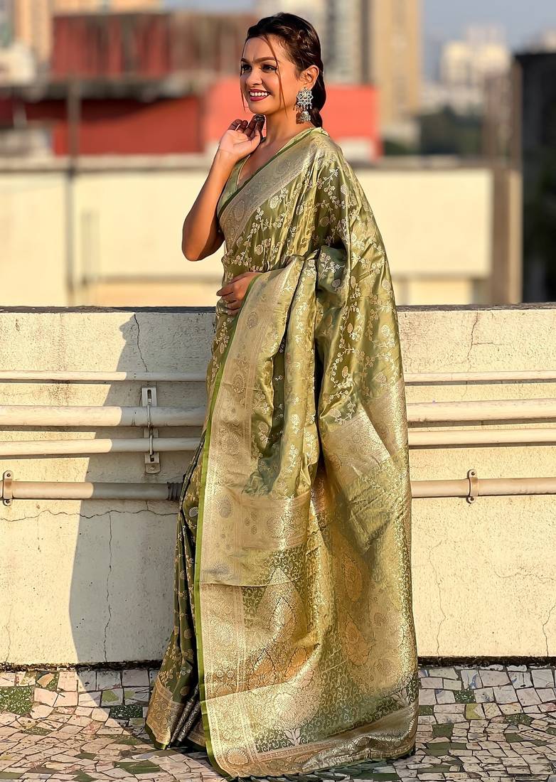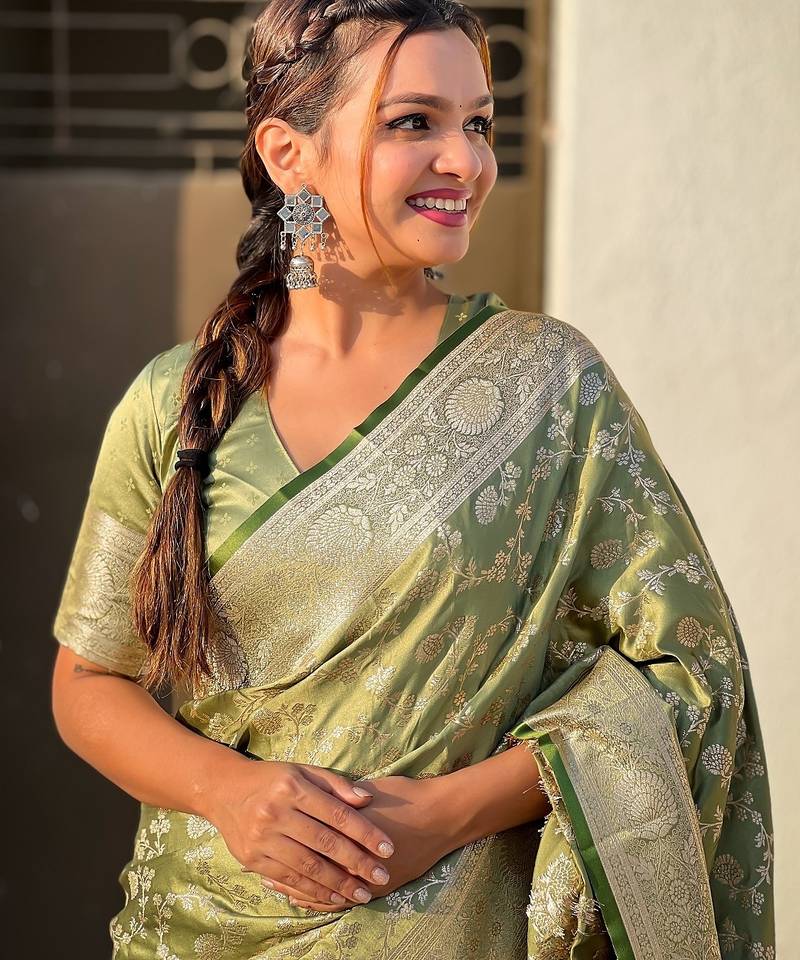 Pista green woven self design antique silk banarasi saree with blouse