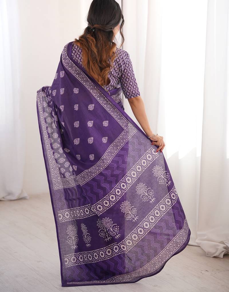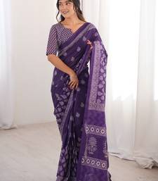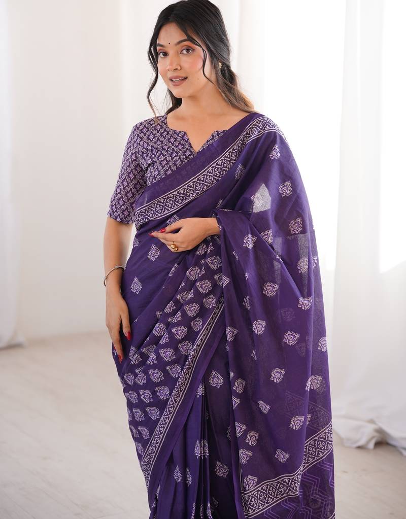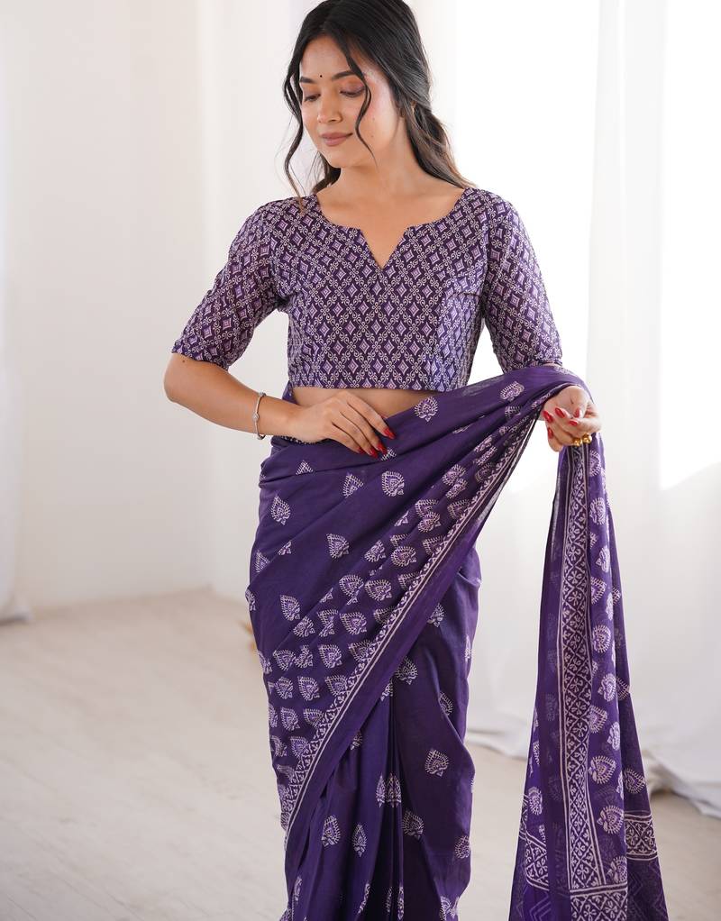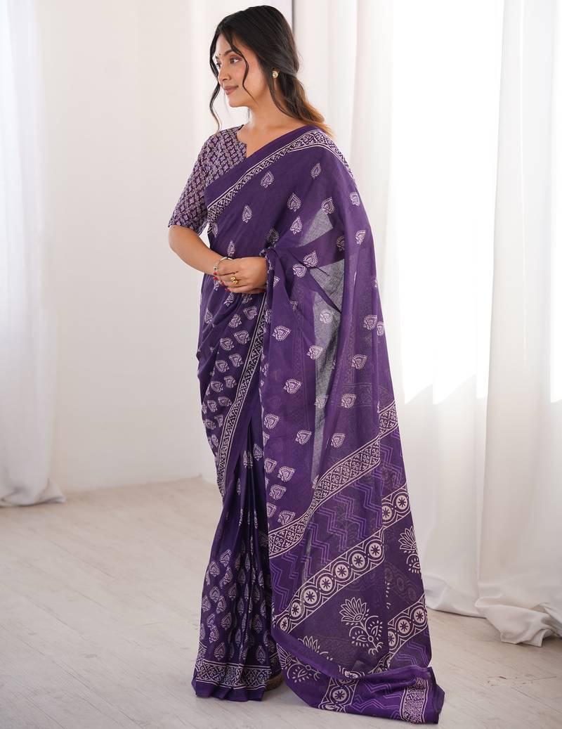 | Product Name | Purple Blocked Printed, Floral Print Soft Pure Cotton Saree With Blouse. | |