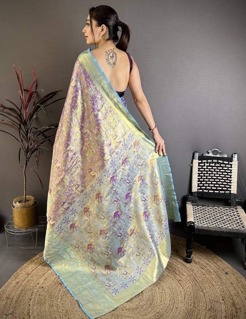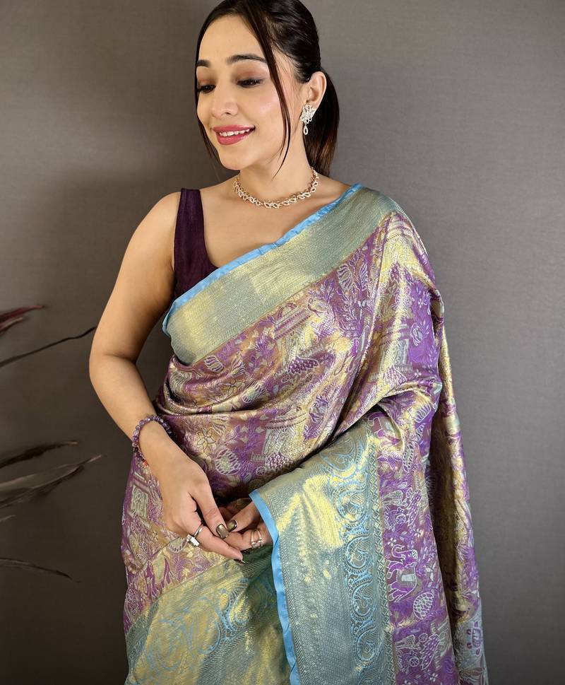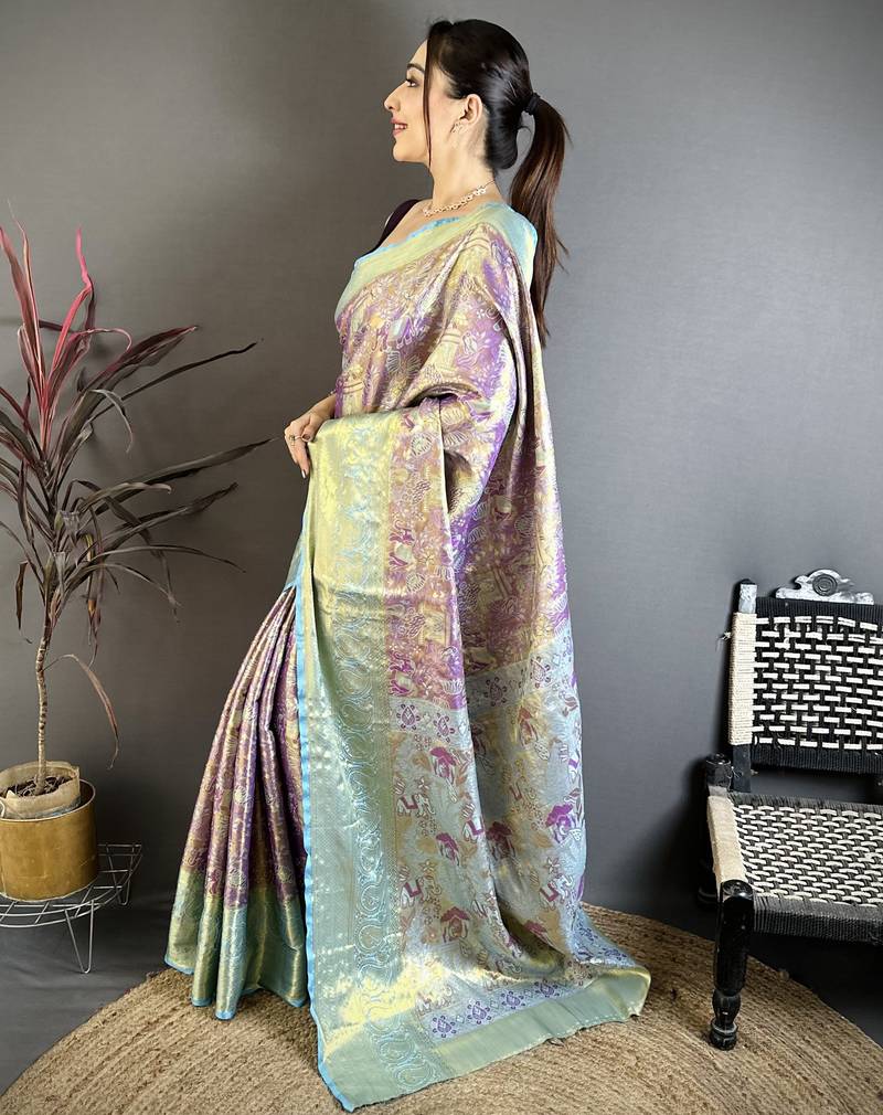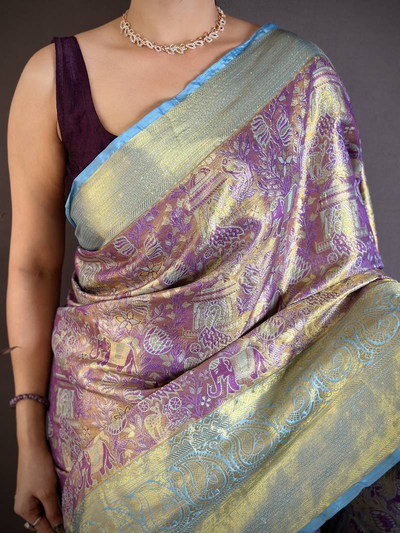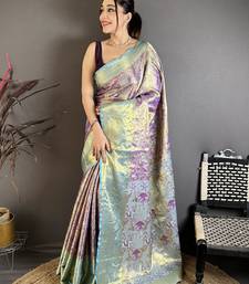 Purple floral, meenakari, zari woven kanjivaram semi silk saree with blouse