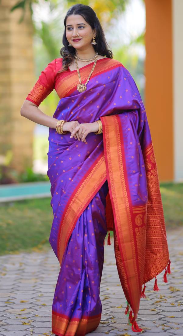 Purple floral, temple border, zari work kanji gadwal silk saree with blouse