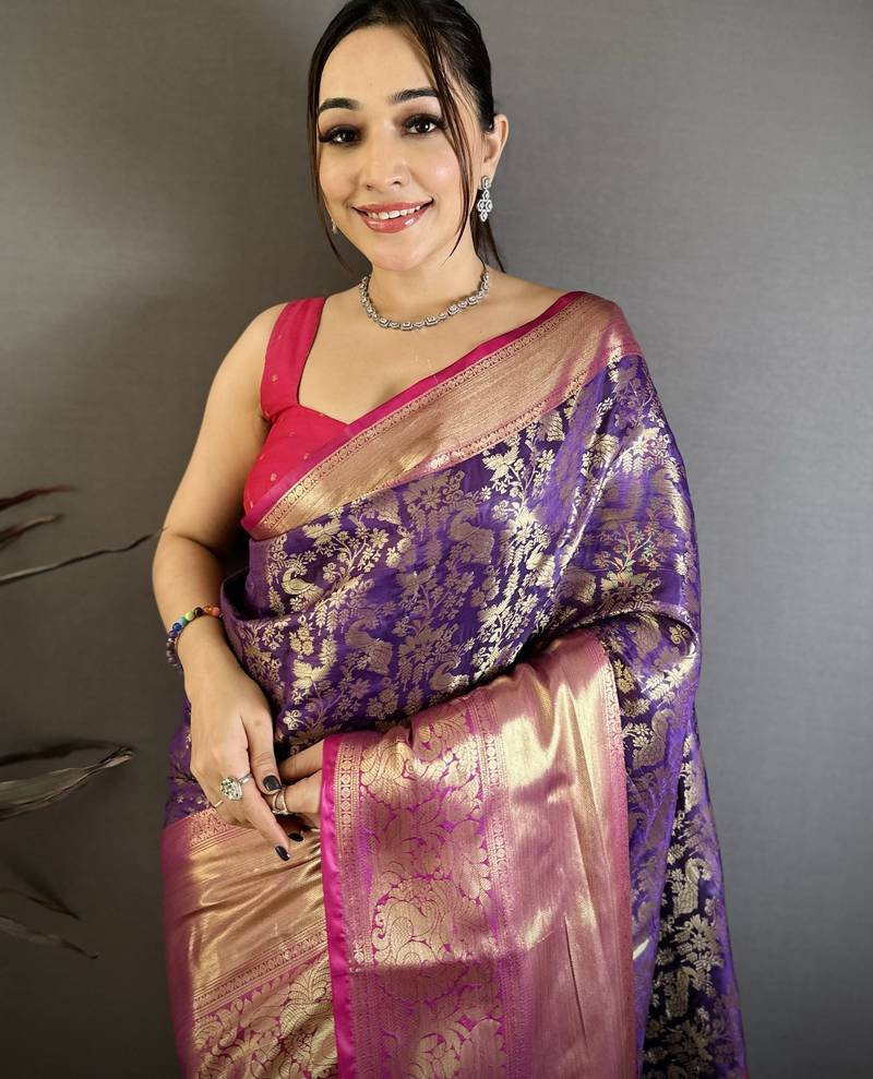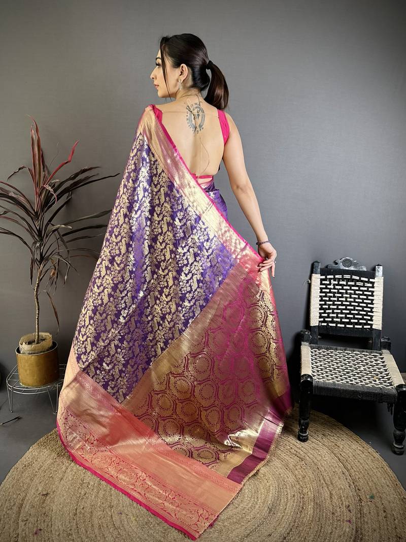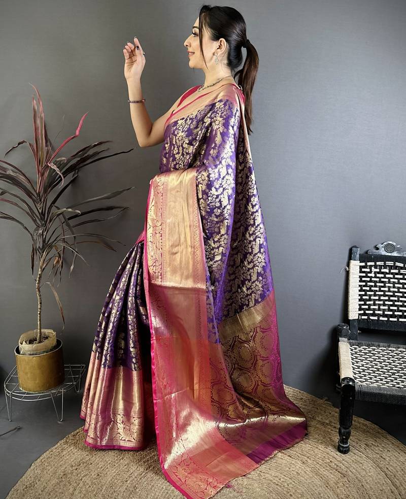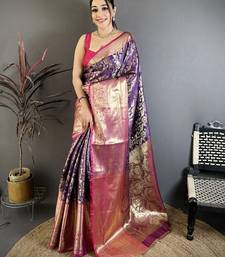 Purple floral, zari work kanjivaram katan silk saree with blouse
