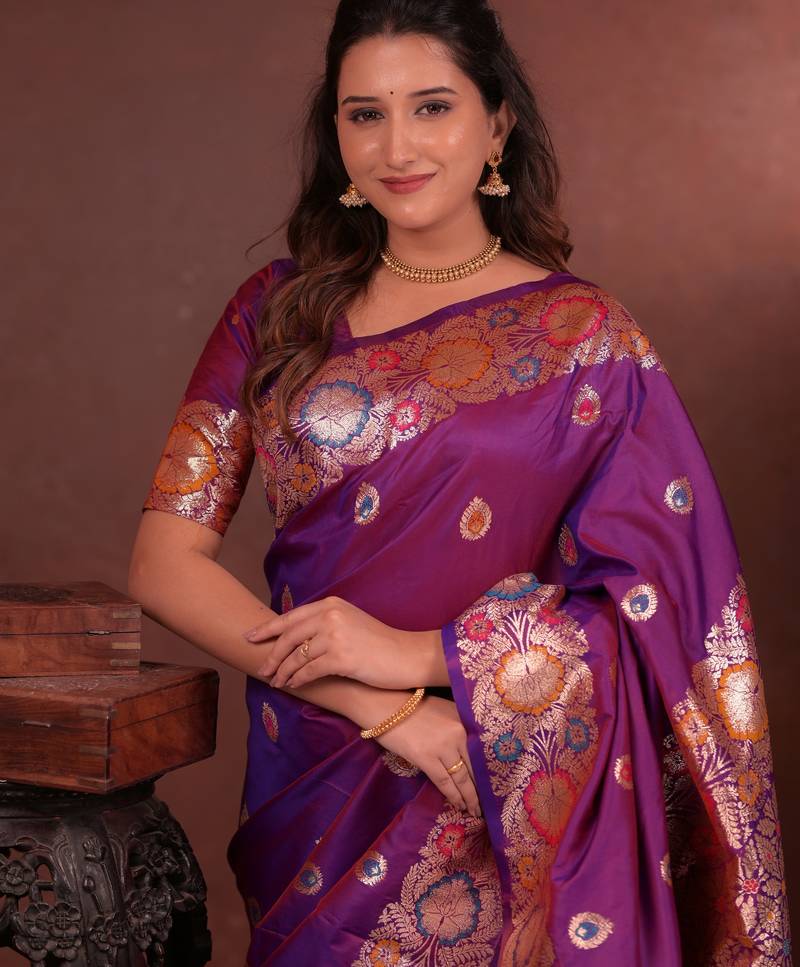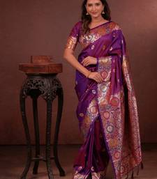 Purple floral, zari woven faux kanjivaram saree with blouse