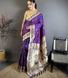 Purple floral, zari woven soft silk saree with blouse