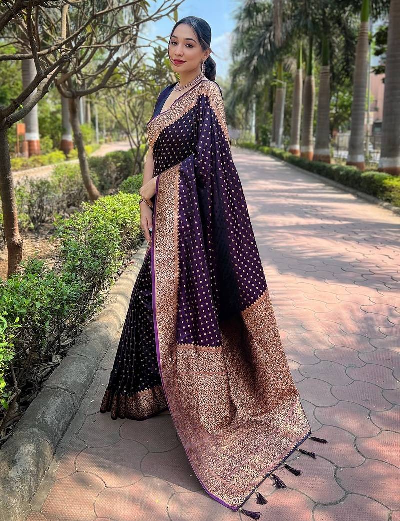 | Product Description | Premium Banarasi Katan Silk Sarees With Tiny Motifs All Over The Body, Having Rich Zari Woven Pallu And Paired With Plain Running Blose |