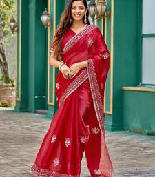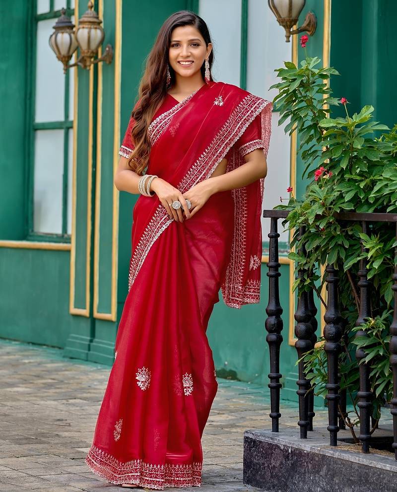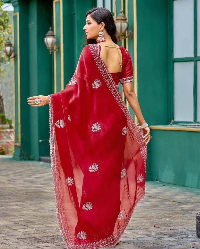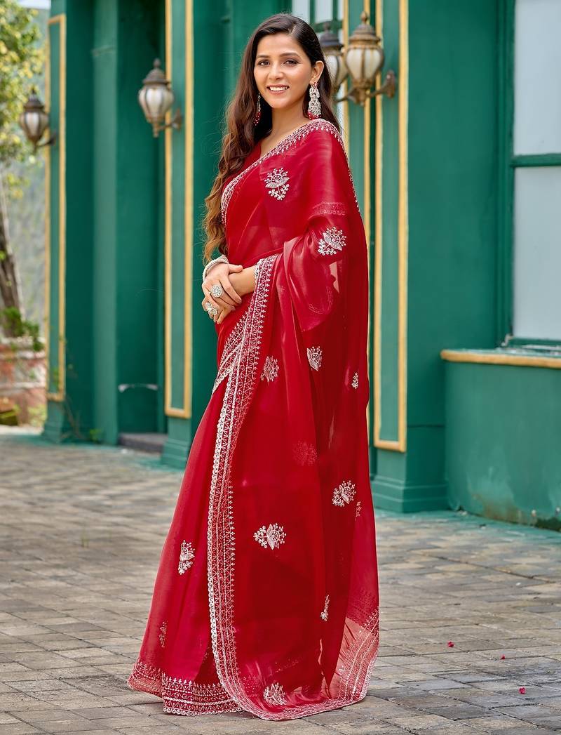 Red embroidered embellished shimmer chiffon bollywood saree with blouse