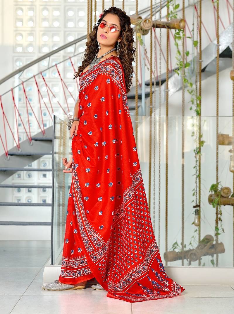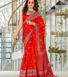Red floral print mulmul cotton saree with blouse.