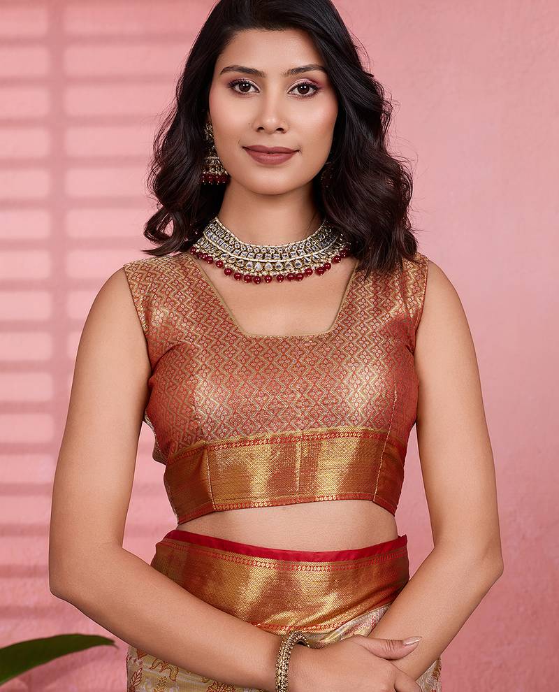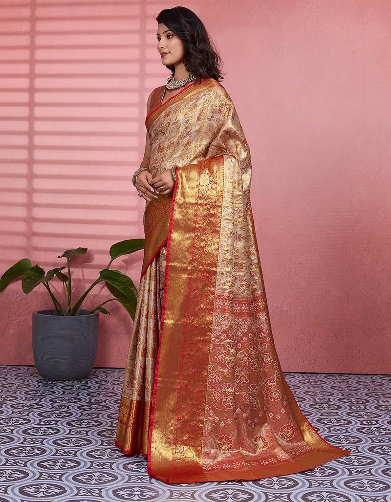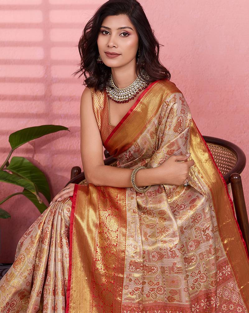 Red floral, zari woven kanjivaram silk saree with blouse