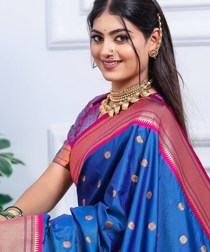 Royal blue floral, temple border, zari woven silk blend saree with blouse
