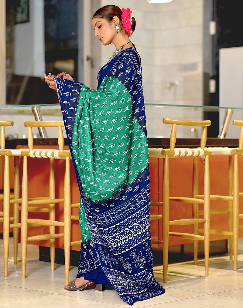 Sea green floral print soft pure cotton saree with blouse.