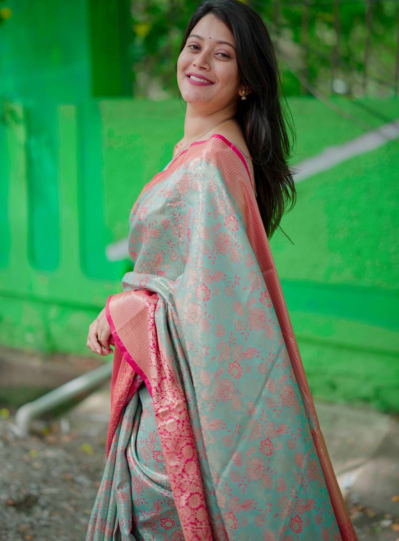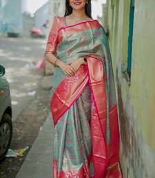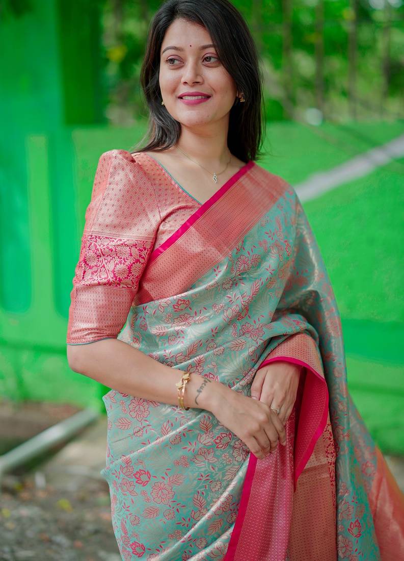 Sea green floral, zari woven faux kanjivaram saree with blouse