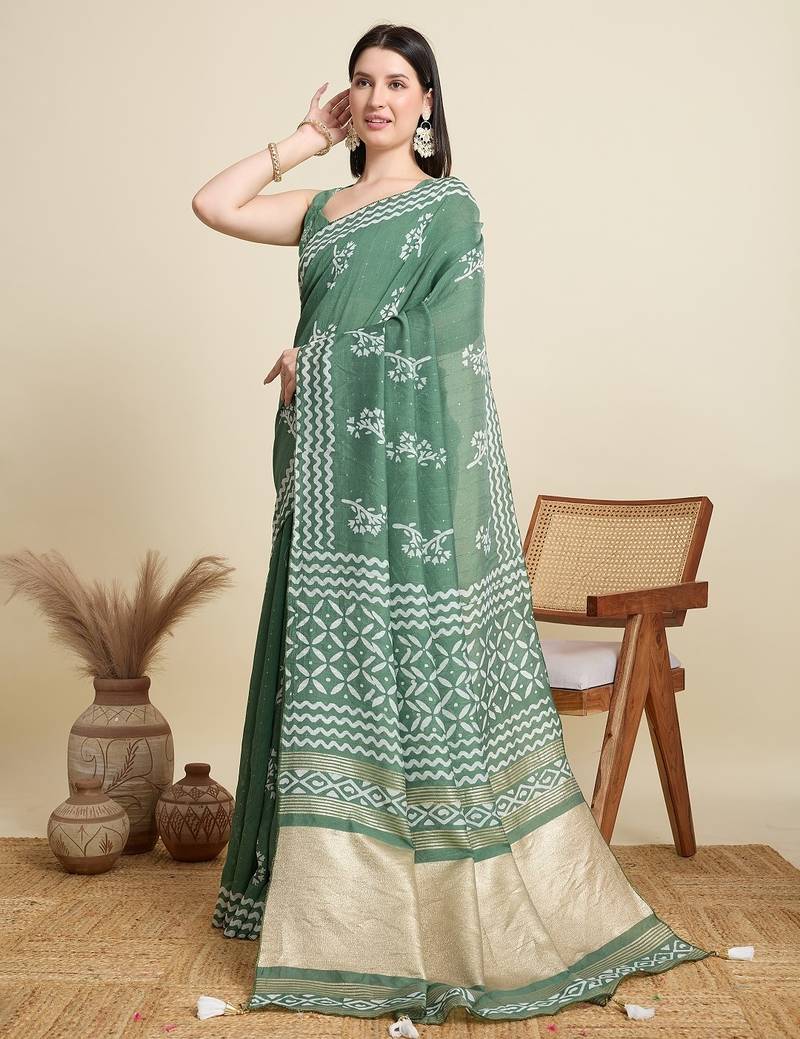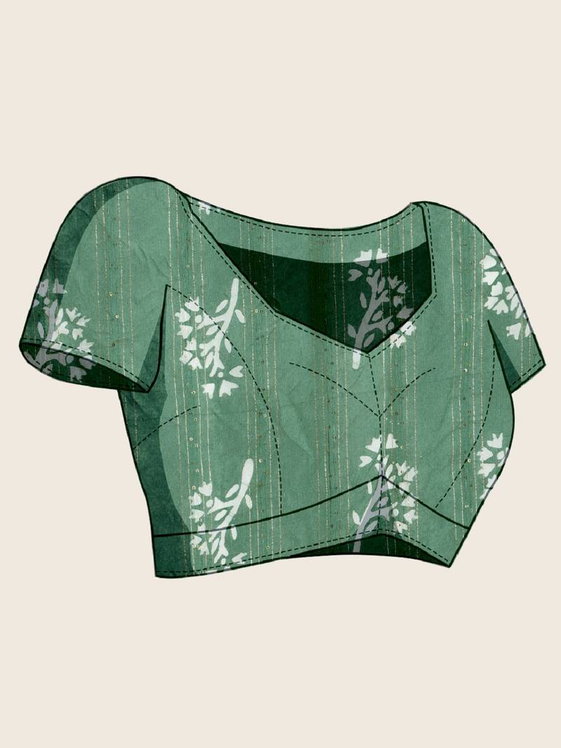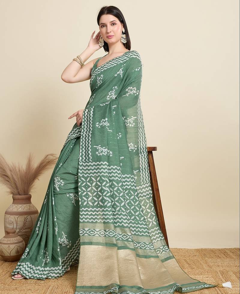Sea green printed color block embellished cotton silk bollywood saree with blouse