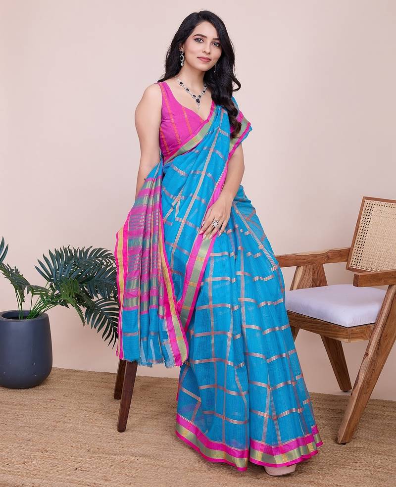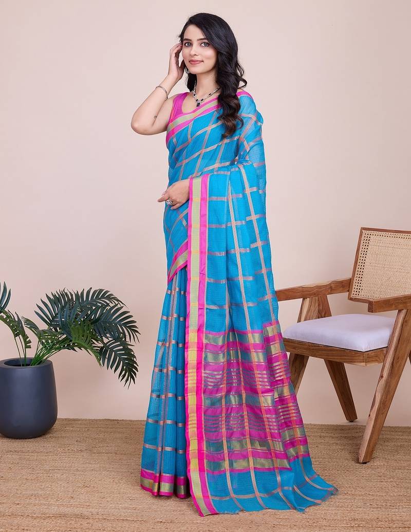 | Product Name | Sky Blue Woven Checkered Striped Cotton Silk Kota Doria Saree With Blouse | |