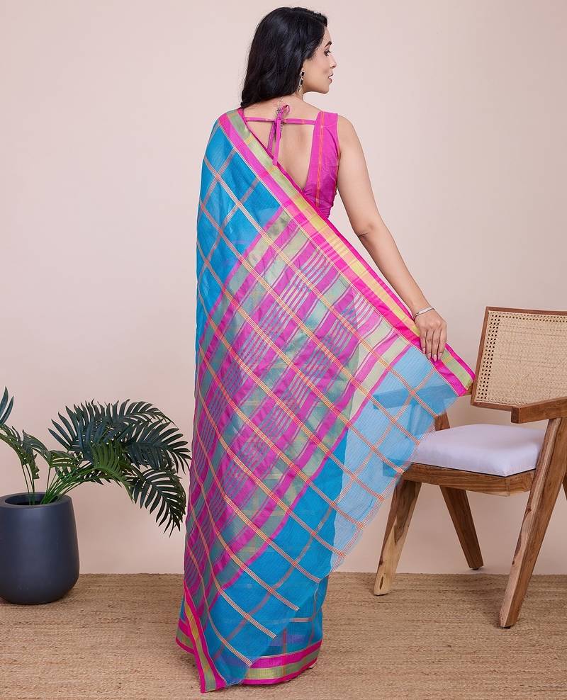 Sky blue woven checkered striped cotton silk kota doria saree with blouse