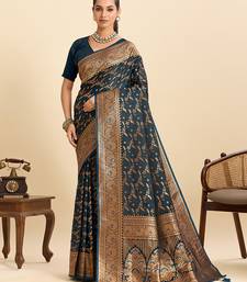 Teal blue embellished floral print soft silk satin banarasi saree with blouse