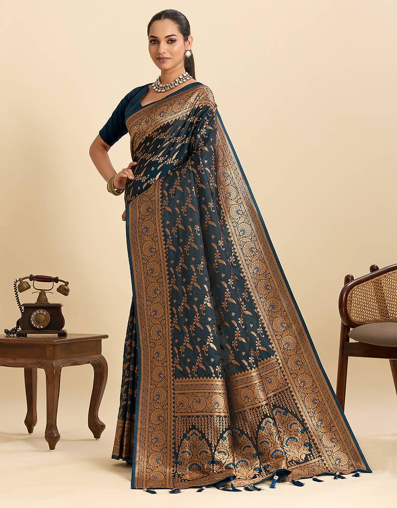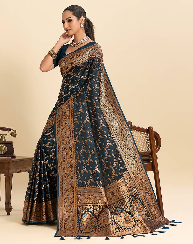 | Product Name | Teal Blue Embellished Floral Print Soft Silk Satin Banarasi Saree With Blouse | |