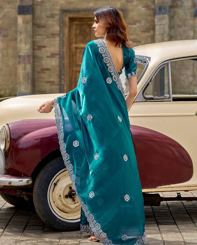 Teal blue embroidered embellished shimmer chiffon bollywood saree with blouse