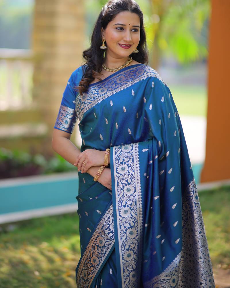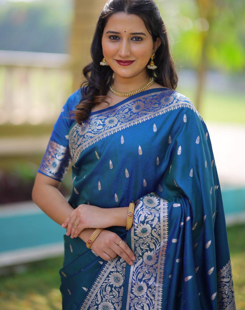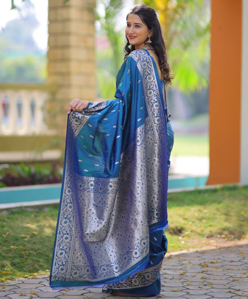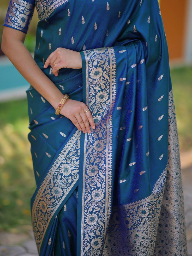 Teal blue floral, zari work banarasi silk saree with blouse