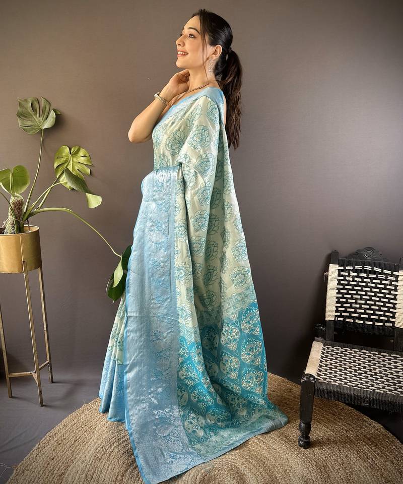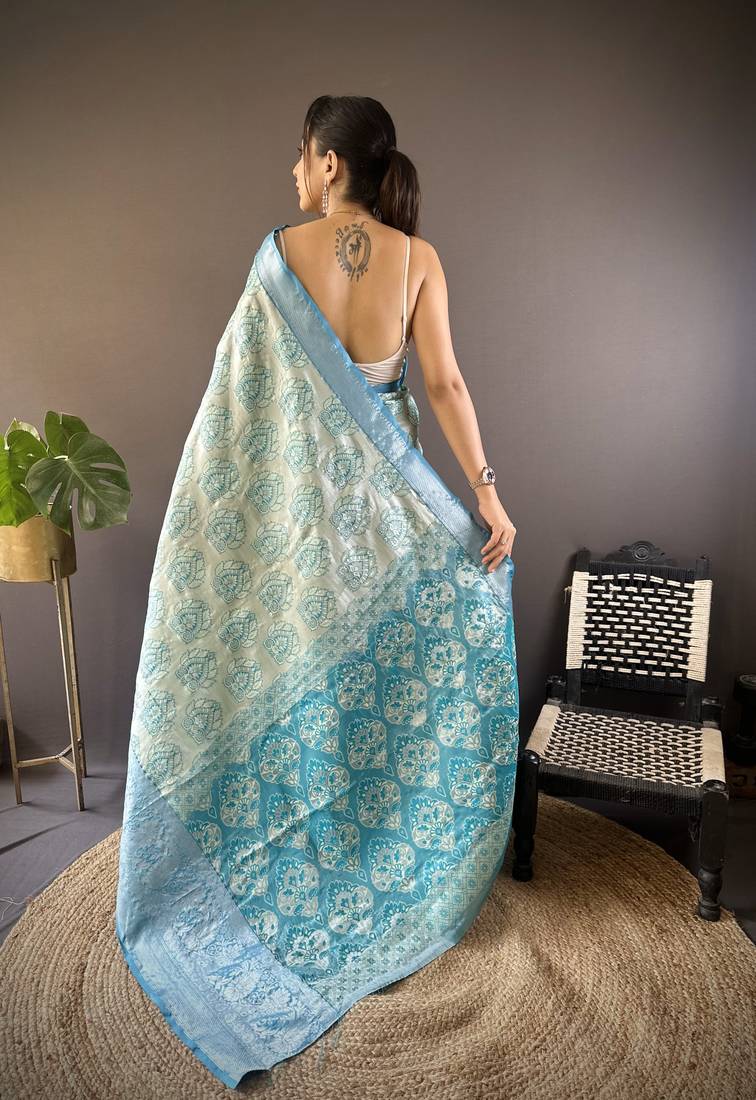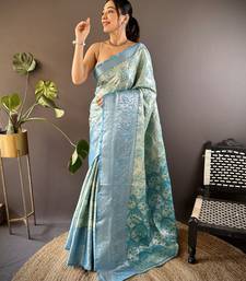 Teal blue floral, zari woven kanjivaram tissue silk saree with blouse