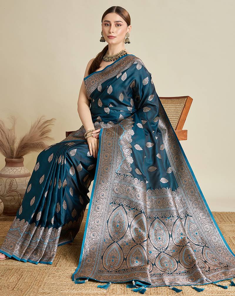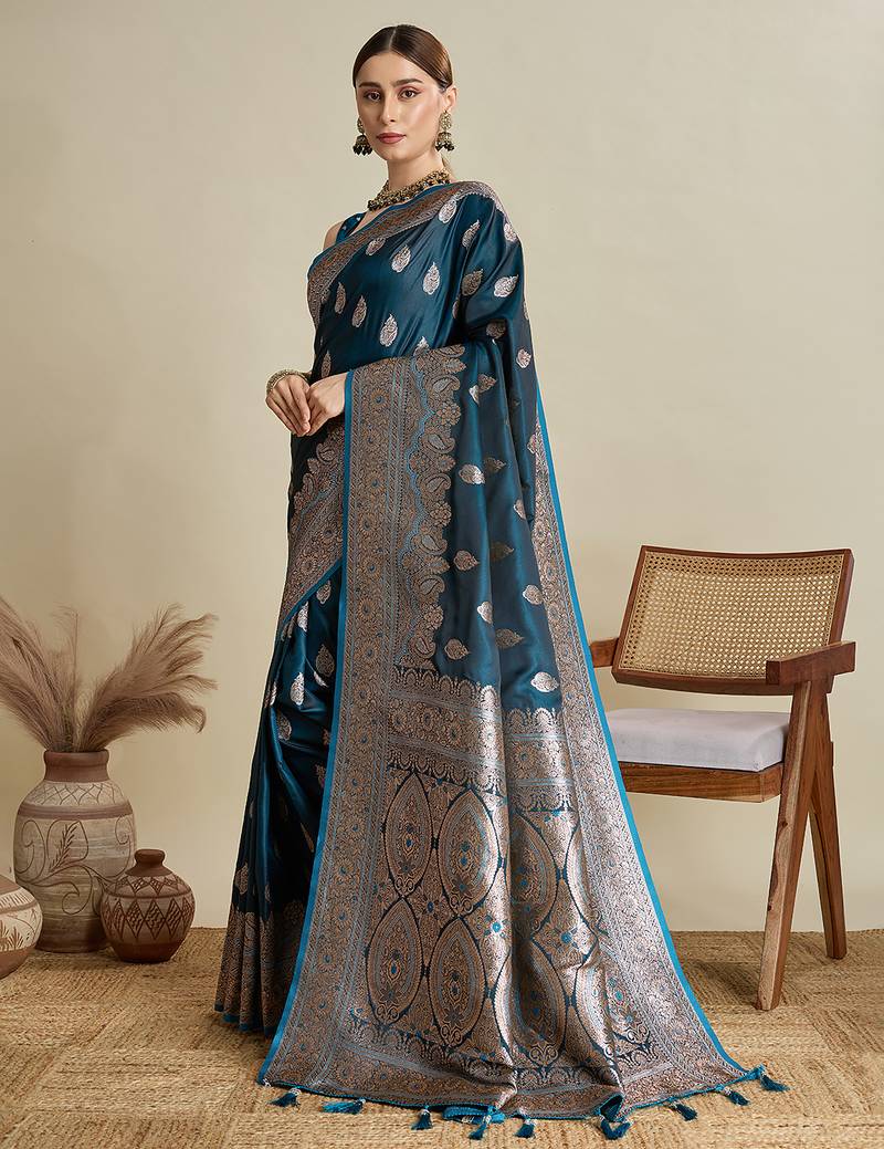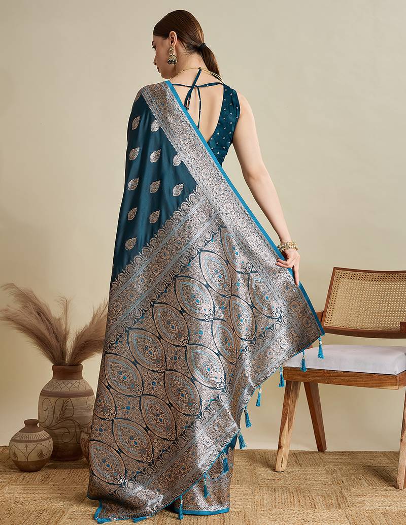 Teal blue woven embellished self design satin silk blend banarasi saree with blouse