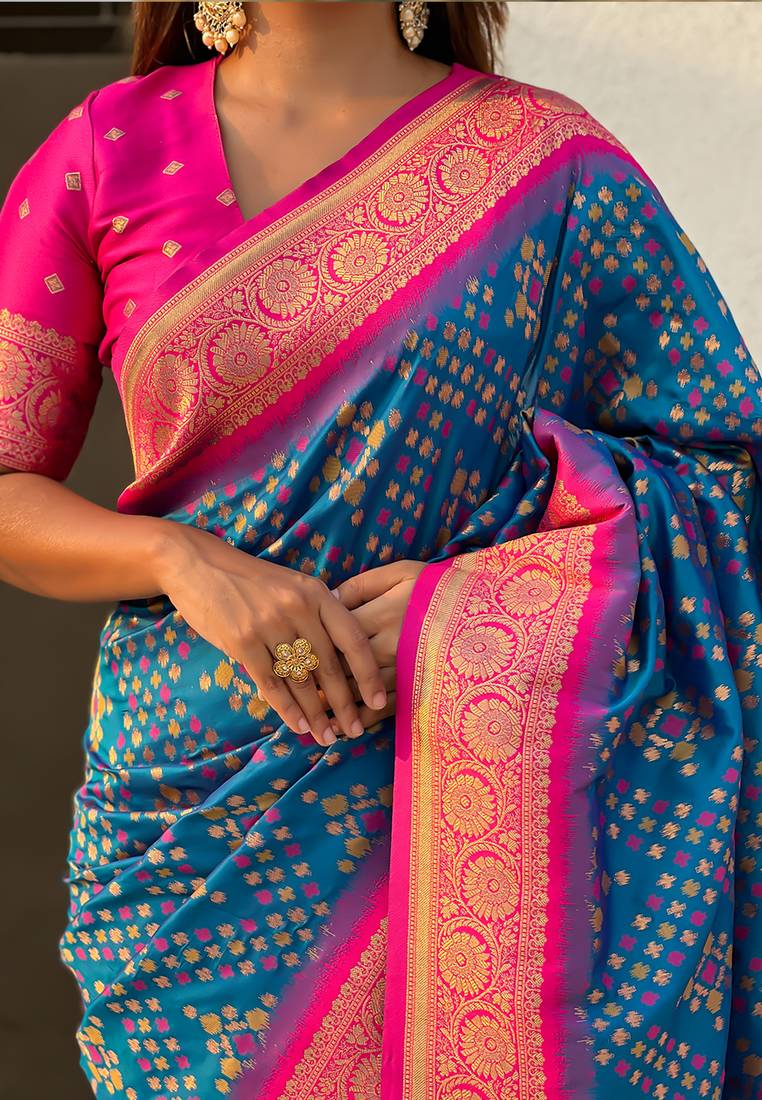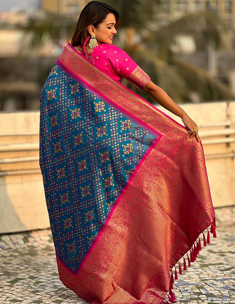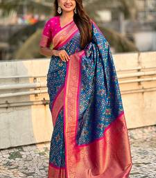 Teal blue woven self design silk blend patola saree with blouse