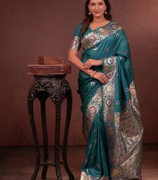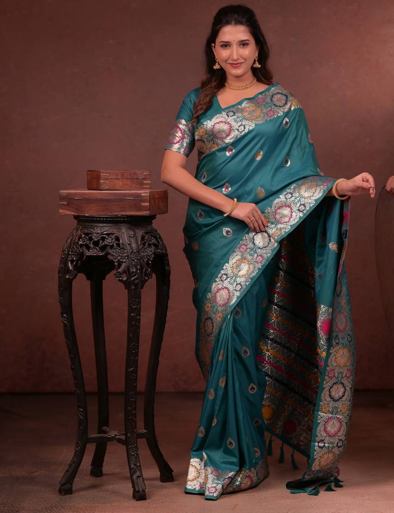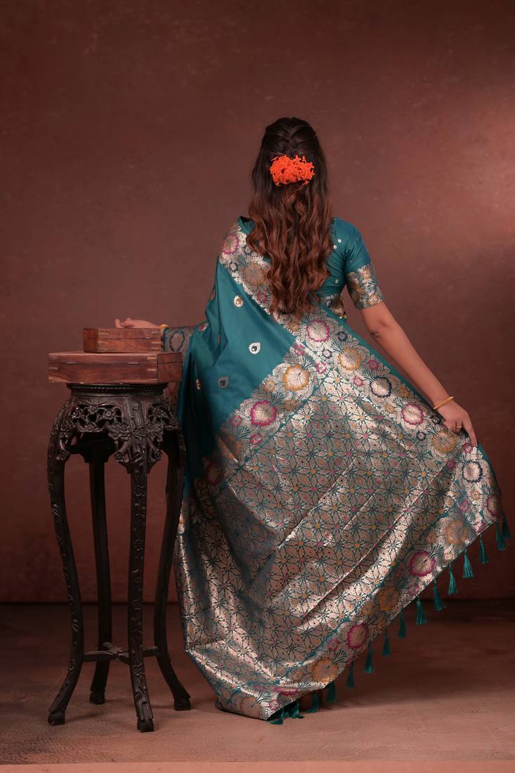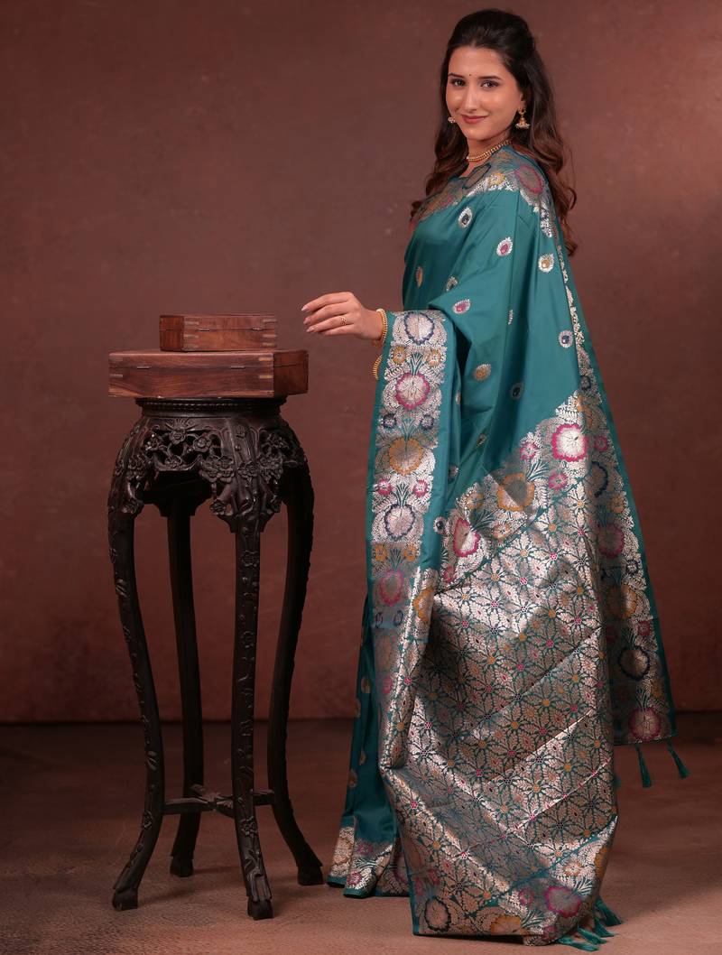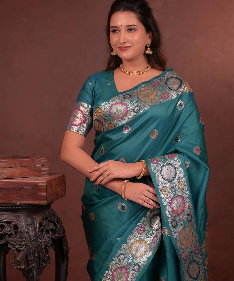 Teal green floral, zari woven faux kanjivaram saree with blouse