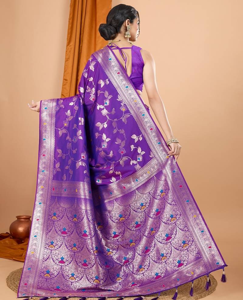 Violet woven self design embellished pure silk banarasi saree with blouse