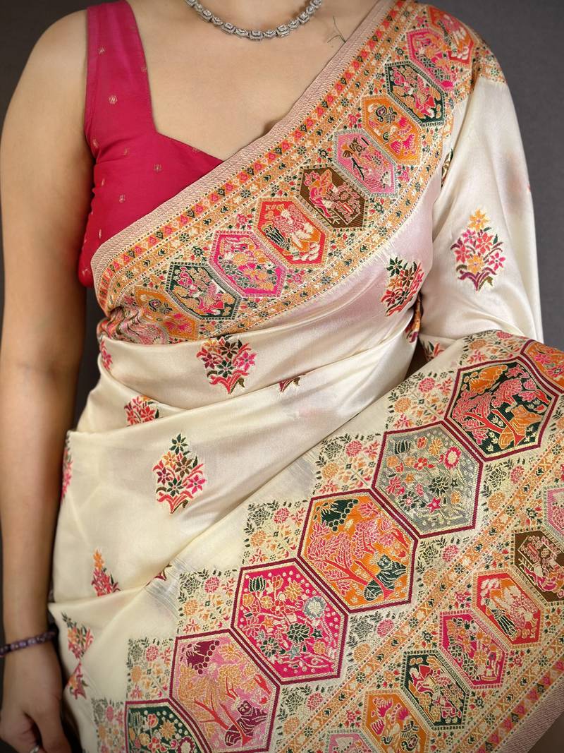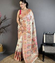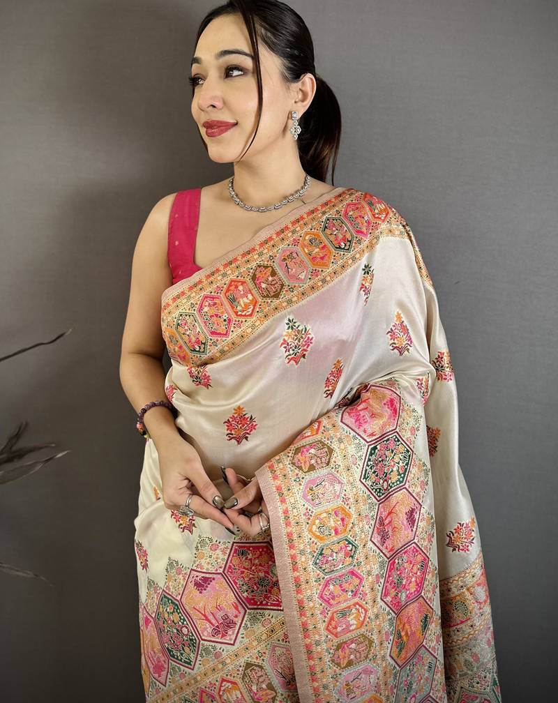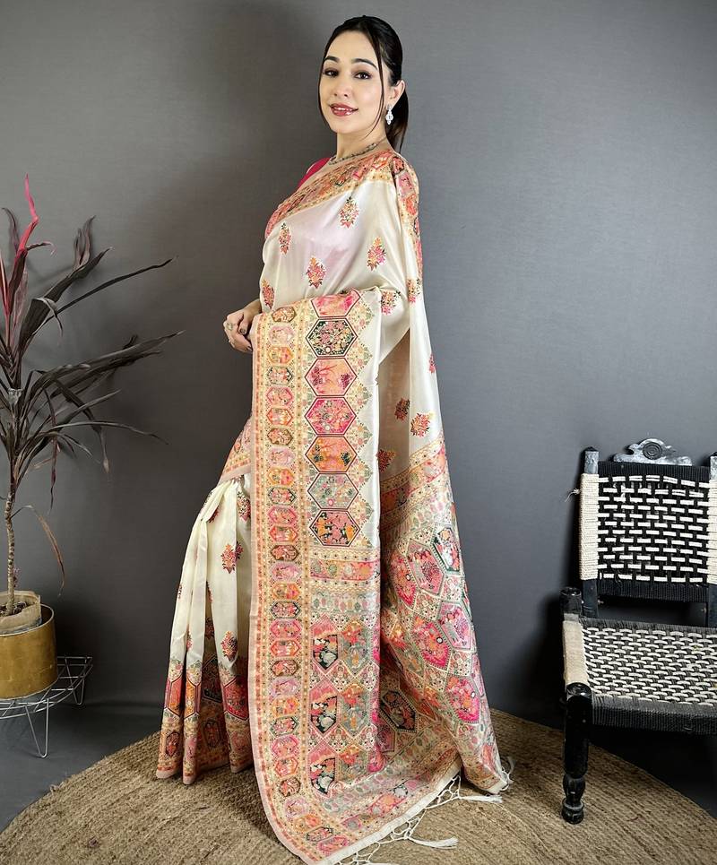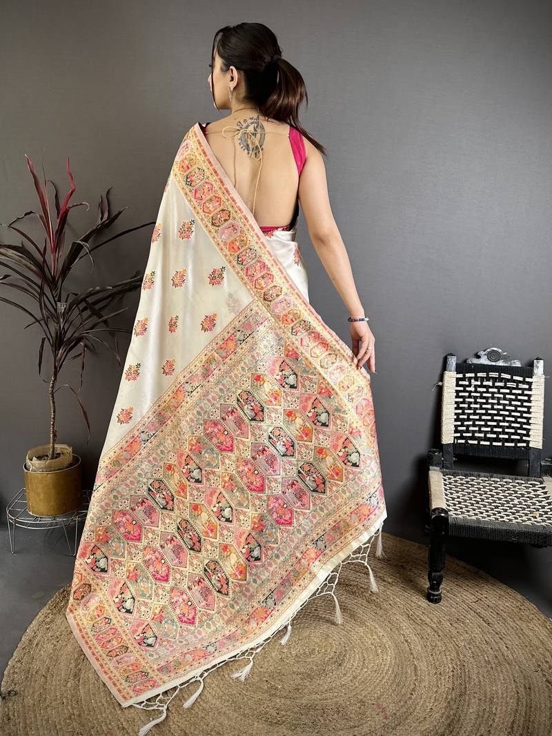 White floral, meenakari, zari woven pashmina silk saree with blouse