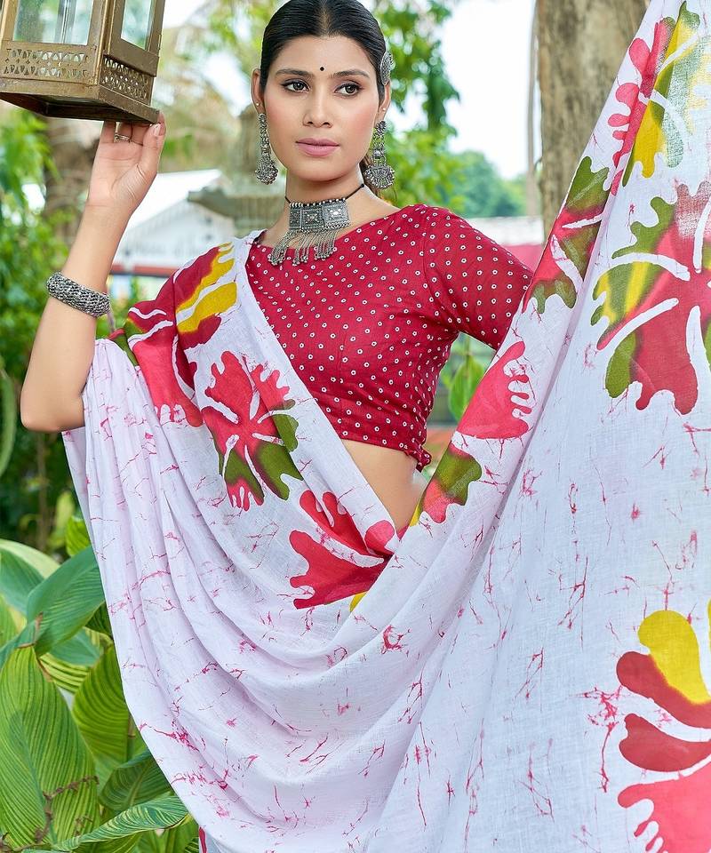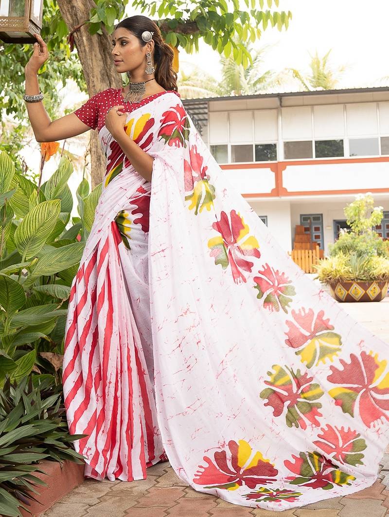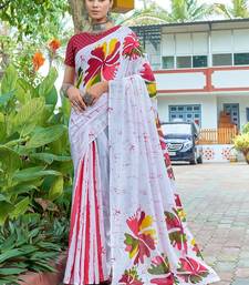 White printed mulmul cotton saree with blouse.